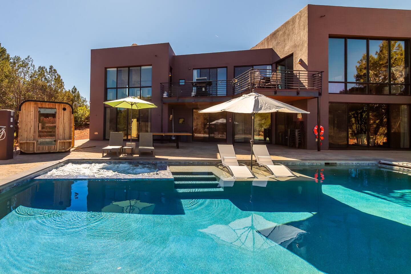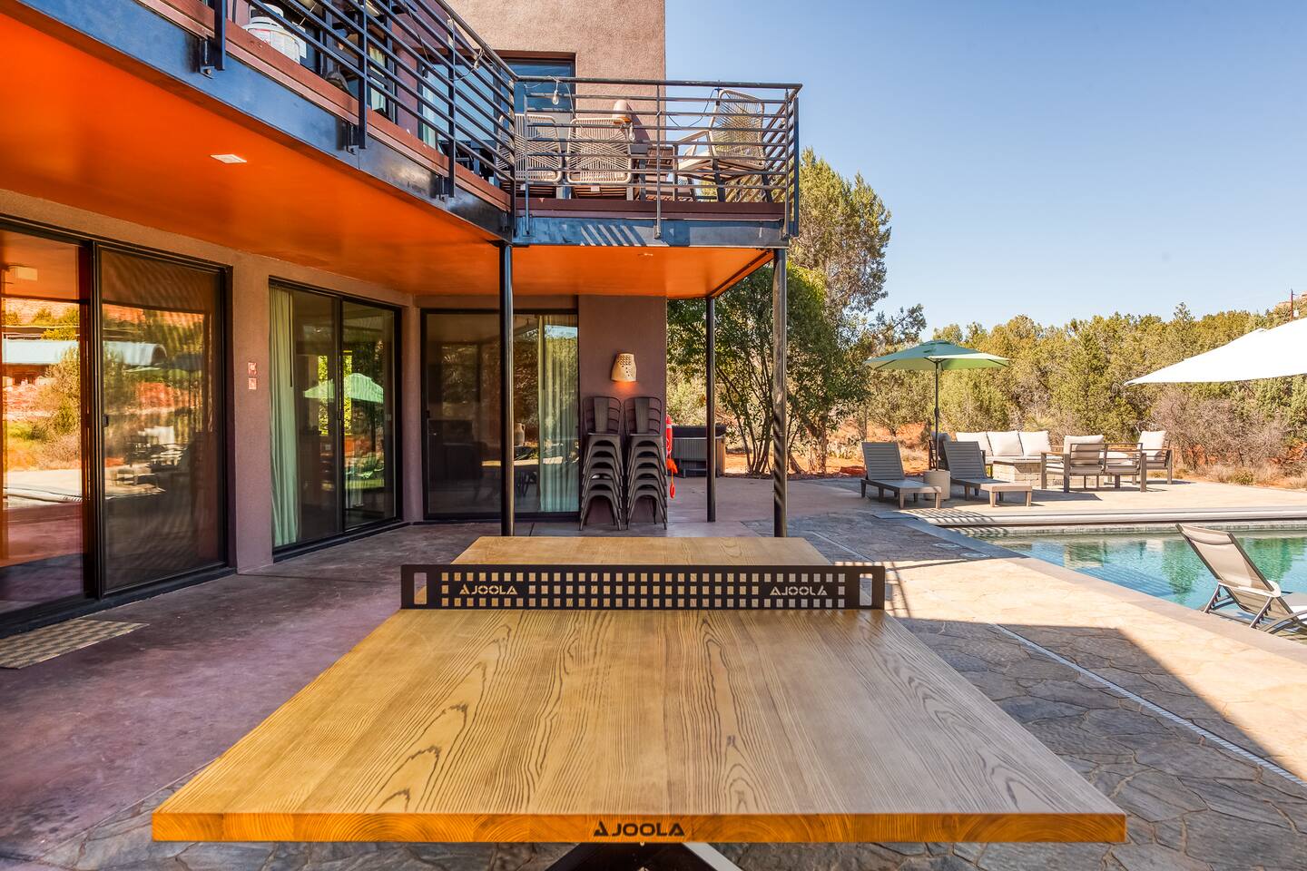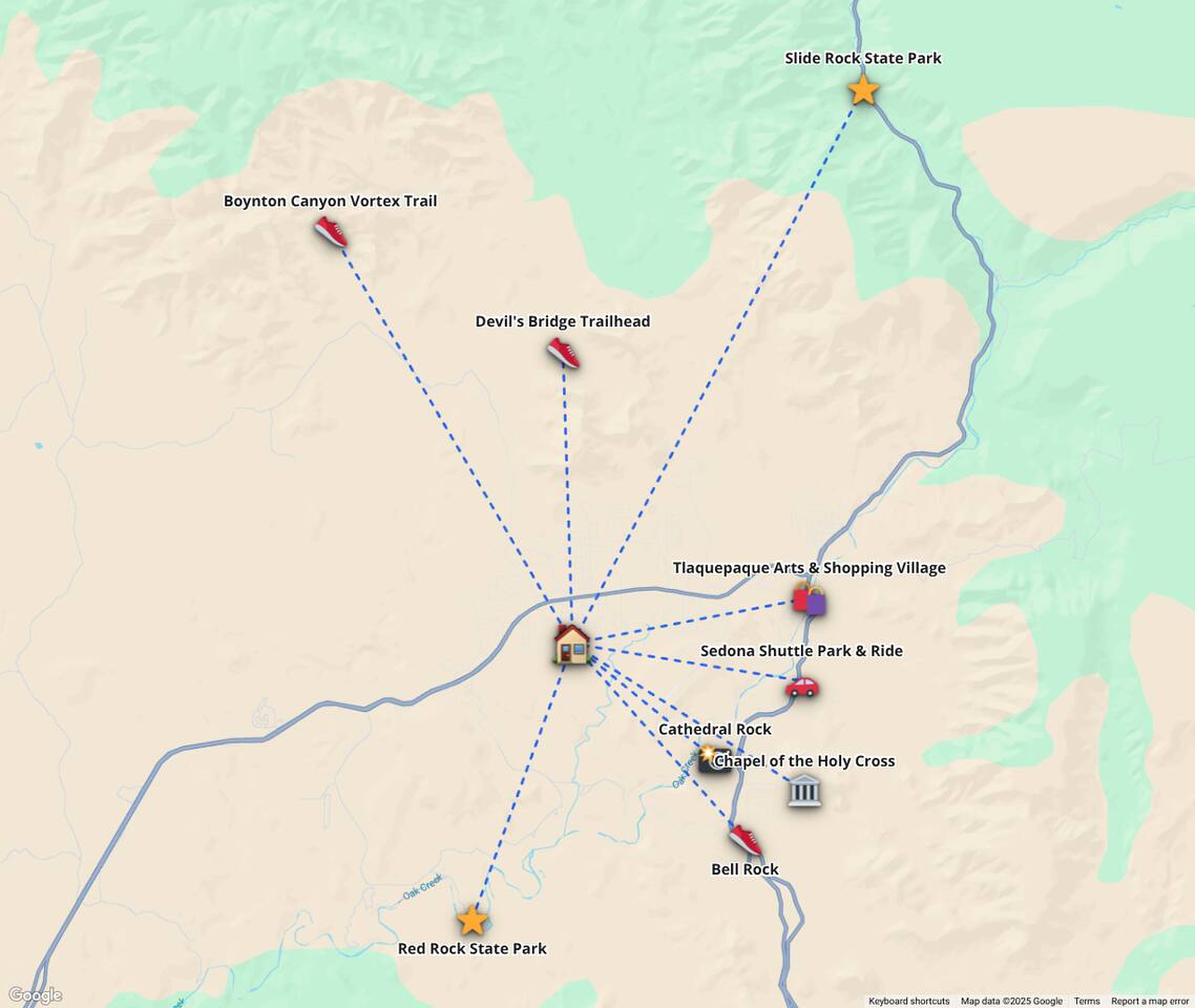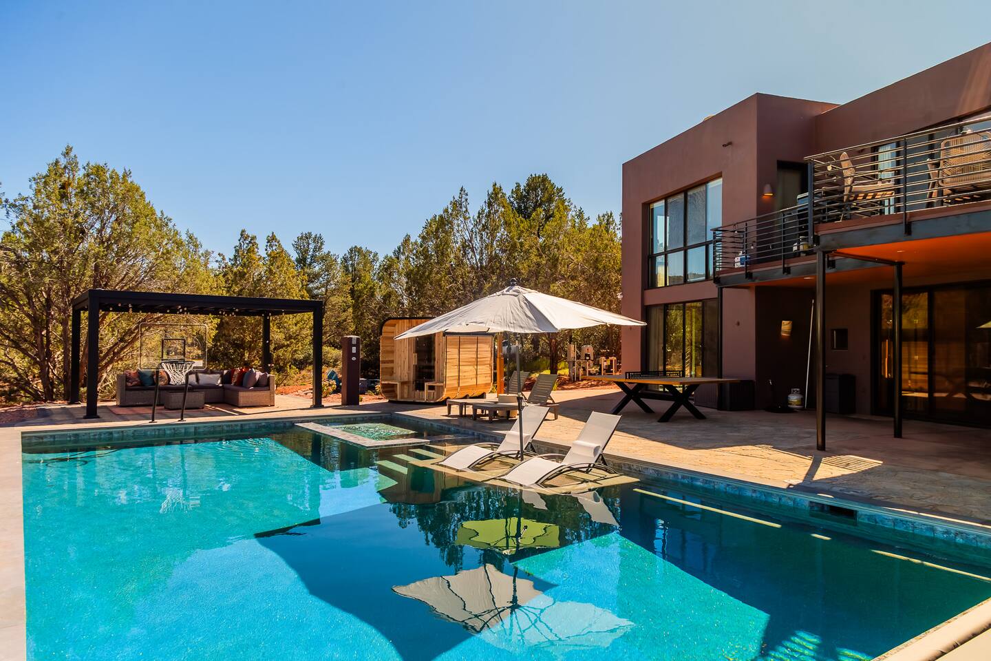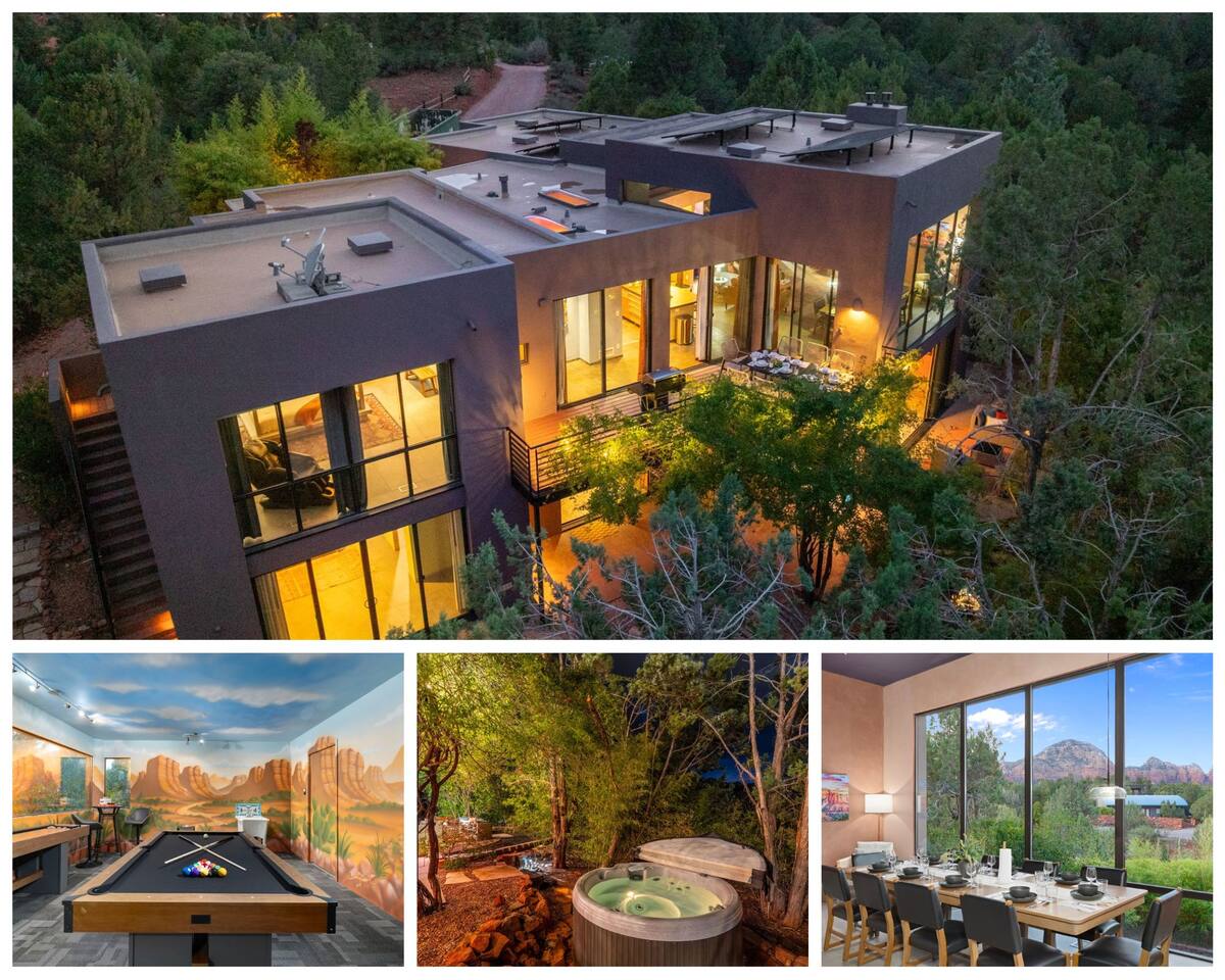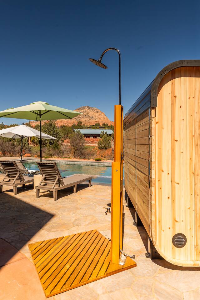 ***EXTERIOR HIGHLIGHTS*** 🏊 Brand New 20'x35' Luxury Heated Saltwater Pool & Spa — Featuring a sun shelf, basketball hoop, and rinse shower! Year round heating available for $100–$150/day – see FAQs for details. Plenty of hardscape area for yoga, meditation, healing, and wellness activities 🌲 Large and private 1-acre wooded lot with a natural desert wash and breathtaking views 🥾 Direct access to a well-maintained trail system right from the backyard ♨️ Authentic cedar cube sauna seats 4-6 🏗️ Pergola and shaded lounge furniture 🔥 2 Cozy gas fire features with Adirondack chairs or soft seating - perfect for desert evenings 🏓 Ping pong table and cornhole. The ping pong tables doubles as a dining table - 12 chairs provided 🍽️ Scenic view deck off the main kitchen with dining for 7 ☕ Private bistro deck off bedroom 2 — ideal for morning coffee or intimate dining for 2 🍽️ Covered patio adjacent to walkout basement with dining for 12 🍖 BBQ grill with complimentary propane 🔌 Stage two EV charger (see FAQs for details) 🌌 Located in a Certified Dark Sky community — ideal for world-class stargazing 🦌 Wildlife: bobcats, jack rabbits, mule deer, owls, javelinas, lizards, and more! ***INTERIOR HIGHLIGHTS*** 🏠 Over 4,000 sq ft of designer-appointed space with stunning floor-to-ceiling windows 🎱 Awesome game room with dual sim racer video game system, pool table, shuffleboard, foosball, and board games! 💺 Massage chair in primary bedroom and heated tile floors in the two ensuite bathrooms 🏋️ Exercise room with swiveling wall-mount bike rack (accommodates 4 large mountain bikes), 3 cushioned yoga mats, exercise ball, bench, dumbells, kettlebells, and a Power Tower 🛋️ Two spacious living rooms with gas fireplaces, smart TVs, and panoramic red rock views 🍽️ Dining for 14 on the main level + 8 more on the lower level — ideal for large groups 🛏️ Uniquely styled bedrooms with memory foam mattresses, smart TVs, and expansive windows 🎮 Bunk room with retro arcade games, smart TV, and reading nook 👨🍳 Fully equipped, chef-ready kitchen on the main level plus a kitchenette with large countertop bar and seating in the basement 🧺 Full laundry with a second dryer for extended stays 🐾 Pets allowed (max of 2 dogs — you must notify host before bringing pets to obtain pre-approval. Please be sure to clean up after your pets. See FAQs for pet details) 🌱 Eco-friendly construction with solar panels, low-VOC materials, and energy-efficient systems ⚡ Fast & Free WiFi MAIN LIVING AREAS: Featuring an open concept with a gas fireplace, full window wall, colorful paint palette, and stunning views of the red rocks, the living room has direct access to two separate decks. The lower level living room also has a fireplace and full glass wall with direct access to the backyard patio and pool area via large sliding glass doors for true indoor/outdoor living. KITCHENS: You'll have everything you need for preparing meals for large groups. In addition to all the standard appliances and kitchen essentials, there's a Keurig with pods provided, blender, filtered water, basic spices, olive oil, dish soap, trash liners, paper towels, dish sponge, cookie sheets, baking dishes, cutting board, mixing bowls, colander, serving bowls/plates, cheese grater, pitcher, wine bottle opener, can opener, pots & pans, measuring cups, spatulas, ladle, whisk, pizza cutter, and more. PRIMARY BEDROOM: This luxurious ensuite bedroom features a king memory foam bed and abundant natural light with a full glass view wall and a massage chair. The bathroom has a custom walk-in mosaic shower with dual shower heads, dual vanities, a huge closet, and a jetted tub. BEDROOM 2: Located on the main level, this bedroom has a king memory foam bed, smart TV, and floor-to-ceiling windows with access to a private deck with seating for 2. The bathroom is accessed through the adjacent hallway. BEDROOM 3: Located on the lower level, this ensuite bedroom features 2 memory foam queen beds and a smart TV with a sliding glass door to access the back yard. The bathroom has double vanities, a tub/shower, and a huge walk-in closet BEDROOM 4: Located on the lower level, this bedroom features a king memory foam bed and floor-to ceiling windows with access to the pool/patio via a sliding glass door. The bathroom has a walk-in shower and is shared with the bedroom 5 (bunk room) and can be isolated from the rest of the home to make a private unit using the keypad lock in the hallway if desired. BEDROOM 5: Located adjacent to bedroom 4 is the bunk room, complete with 2 bunk beds, a smart TV, an arcade console, and a reading nook. PRIVATE BACKYARD OASIS: Recline on the comfortable loungers by the expansive 35’x20’ heated pool complete with basketball hoop, baja lounge shelf, large paver deck with a pergola and gas firepit, a rinse-off shower, and colorful LED night lighting. GAME ROOM: Features a full desert mural on all four walls and the ceiling. There's something for everyone with board games, pool table, shuffleboard, foosball, and sim racing style video games on Xbox like Forza Horizon 5. The sim racing setup includes two cockpits for head-to-head racing. Each cockpit has it's own realistic racing seat, steering wheel, and pedals + noise canceling headphones and a 55" TV so that you can zero in on smokin' the competition! EXERCISE ROOM: You won't have to miss a workout while you're visiting Sedona - just visit the "Desert Gains" gym! Equipment includes an exercise ball, cushioned mats, bench, dumbells, and kettlebells. Use the Power Tower for pull-ups, dips, leg raises, pushups, calf raises, and more. Other things to note: Maintenance personnel performing pest control services, spa maintenance, filter changes, and other light maintenance tasks will occasionally need access to the property. They may show up during normal business hours without notice and will knock and ring the d