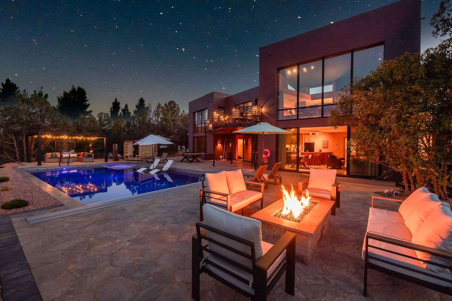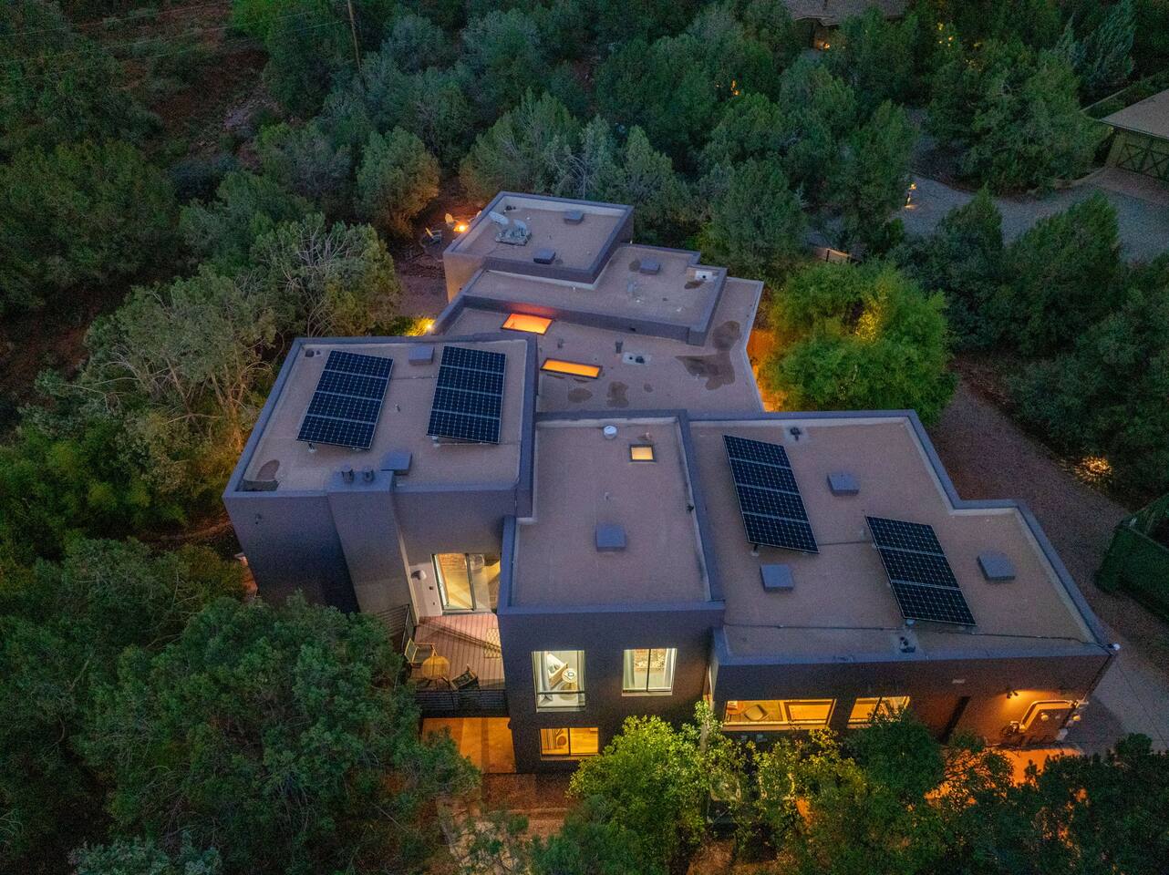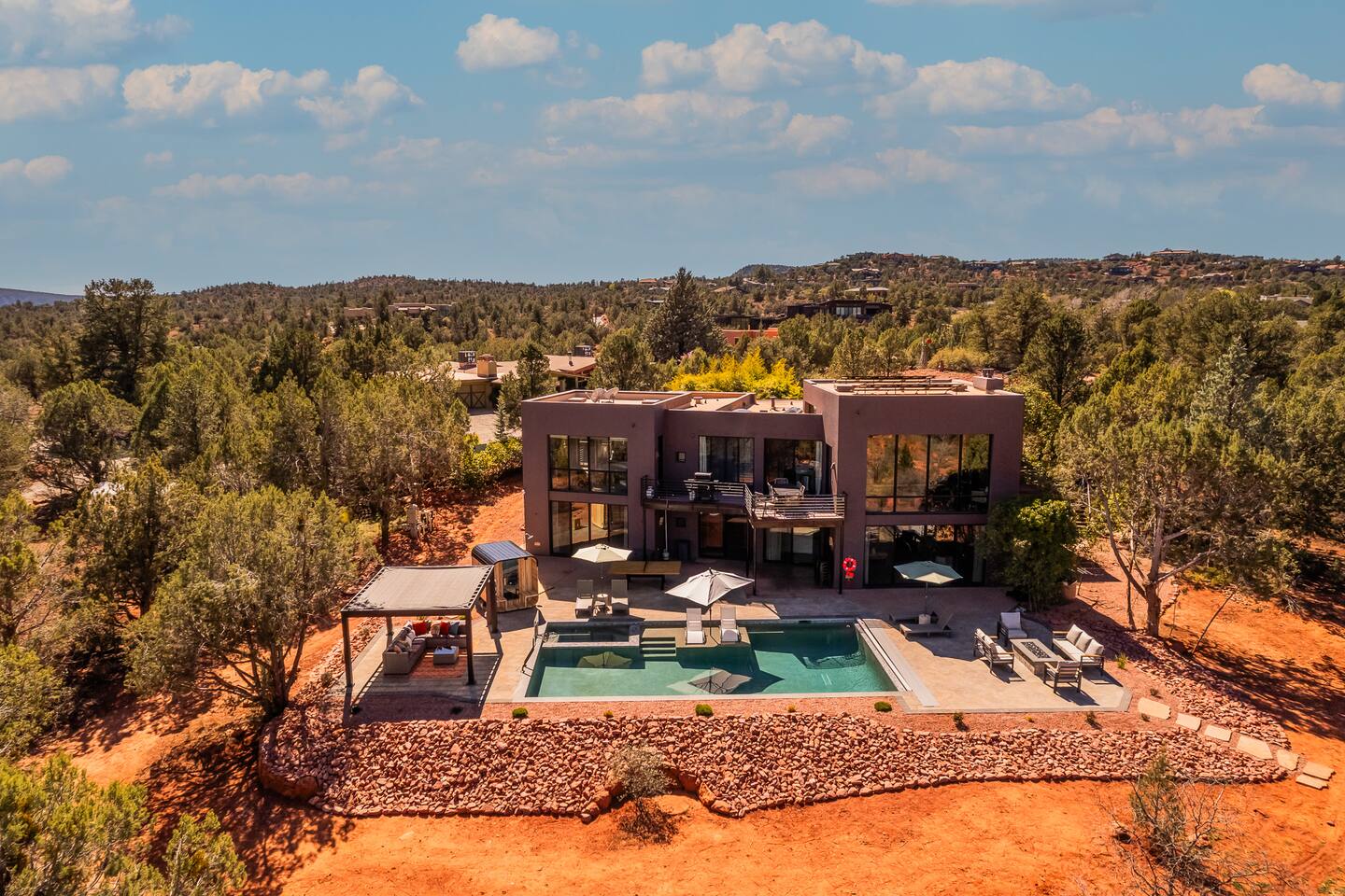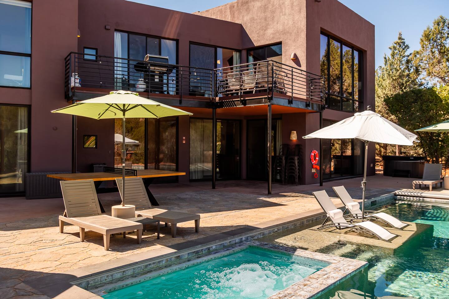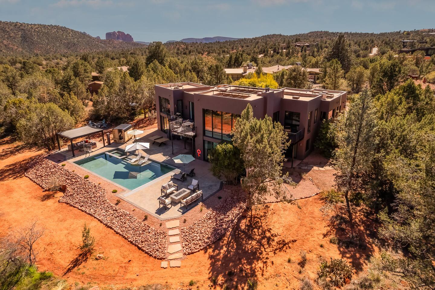 ***EXTERIOR HIGHLIGHTS*** 🏊 Brand New 20'x35' Luxury Heated Saltwater Pool & Spa — Featuring a sun shelf, basketball hoop, and rinse shower! Year round heating available for $100–$150/day – see FAQs for details. Plenty of hardscape area for yoga, meditation, healing, and wellness activities 🌲 Large and private 1-acre wooded lot with a natural desert wash and breathtaking views 🥾 Direct access to a well-maintained trail system right from the backyard ♨️ Authentic cedar cube sauna seats 4-6 🏗️ Pergola and shaded lounge furniture 🔥 2 Cozy gas fire features with Adirondack chairs or soft seating - perfect for desert evenings 🏓 Ping pong table and cornhole. The ping pong tables doubles as a dining table - 12 chairs provided 🍽️ Scenic view deck off the main kitchen with dining for 7 ☕ Private bistro deck off bedroom 2 — ideal for morning coffee or intimate dining for 2 🍽️ Covered patio adjacent to walkout basement with dining for 12 🍖 BBQ grill with complimentary propane 🔌 Stage two EV charger (see FAQs for details) 🌌 Located in a Certified Dark Sky community — ideal for world-class stargazing 🦌 Wildlife: bobcats, jack rabbits, mule deer, owls, javelinas, lizards, and more! ***INTERIOR HIGHLIGHTS*** 🏠 Over 4,000 sq ft of designer-appointed space with stunning floor-to-ceiling windows 🎱 Awesome game room with dual sim racer video game system, pool table, shuffleboard, foosball, and board games! 💺 Massage chair in primary bedroom and heated tile floors in the two ensuite bathrooms 🏋️ Exercise room with swiveling wall-mount bike rack (accommodates 4 large mountain bikes), 3 cushioned yoga mats, exercise ball, bench, dumbells, kettlebells, and a Power Tower 🛋️ Two spacious living rooms with gas fireplaces, smart TVs, and panoramic red rock views 🍽️ Dining for 14 on the main level + 8 more on the lower level — ideal for large groups 🛏️ Uniquely styled bedrooms with memory foam mattresses, smart TVs, and expansive windows 🎮 Bunk room with retro arcade games, smart TV, and reading nook 👨🍳 Fully equipped, chef-ready kitchen on the main level plus a kitchenette with large countertop bar and seating in the basement 🧺 Full laundry with a second dryer for extended stays 🐾 Pets allowed (max of 2 dogs — you must notify host before bringing pets to obtain pre-approval. Please be sure to clean up after your pets. See FAQs for pet details) 🌱 Eco-friendly construction with solar panels, low-VOC materials, and energy-efficient systems ⚡ Fast & Free WiFi MAIN LIVING AREAS: Featuring an open concept with a gas fireplace, full window wall, colorful paint palette, and stunning views of the red rocks, the living room has direct access to two separate decks. The lower level living room also has a fireplace and full glass wall with direct access to the backyard patio and pool area via large sliding glass doors for true indoor/outdoor living. KITCHENS: You'll have everything you need for preparing meals for large groups. In addition to all the standard appliances and kitchen essentials, there's a Keurig with pods provided, blender, filtered water, basic spices, olive oil, dish soap, trash liners, paper towels, dish sponge, cookie sheets, baking dishes, cutting board, mixing bowls, colander, serving bowls/plates, cheese grater, pitcher, wine bottle opener, can opener, pots & pans, measuring cups, spatulas, ladle, whisk, pizza cutter, and more. PRIMARY BEDROOM: This luxurious ensuite bedroom features a king memory foam bed and abundant natural light with a full glass view wall and a massage chair. The bathroom has a custom walk-in mosaic shower with dual shower heads, dual vanities, a huge closet, and a jetted tub. BEDROOM 2: Located on the main level, this bedroom has a king memory foam bed, smart TV, and floor-to-ceiling windows with access to a private deck with seating for 2. The bathroom is accessed through the adjacent hallway. BEDROOM 3: Located on the lower level, this ensuite bedroom features 2 memory foam queen beds and a smart TV with a sliding glass door to access the back yard. The bathroom has double vanities, a tub/shower, and a huge walk-in closet BEDROOM 4: Located on the lower level, this bedroom features a king memory foam bed and floor-to ceiling windows with access to the pool/patio via a sliding glass door. The bathroom has a walk-in shower and is shared with the bedroom 5 (bunk room) and can be isolated from the rest of the home to make a private unit using the keypad lock in the hallway if desired. BEDROOM 5: Located adjacent to bedroom 4 is the bunk room, complete with 2 bunk beds, a smart TV, an arcade console, and a reading nook. PRIVATE BACKYARD OASIS: Recline on the comfortable loungers by the expansive 35’x20’ heated pool complete with basketball hoop, baja lounge shelf, large paver deck with a pergola and gas firepit, a rinse-off shower, and colorful LED night lighting. GAME ROOM: Features a full desert mural on all four walls and the ceiling. There's something for everyone with board games, pool table, shuffleboard, foosball, and sim racing style video games on Xbox like Forza Horizon 5. The sim racing setup includes two cockpits for head-to-head racing. Each cockpit has it's own realistic racing seat, steering wheel, and pedals + noise canceling headphones and a 55" TV so that you can zero in on smokin' the competition! EXERCISE ROOM: You won't have to miss a workout while you're visiting Sedona - just visit the "Desert Gains" gym! Equipment includes an exercise ball, cushioned mats, bench, dumbells, and kettlebells. Use the Power Tower for pull-ups, dips, leg raises, pushups, calf raises, and more. Other things to note: Maintenance personnel performing pest control services, spa maintenance, filter changes, and other light maintenance tasks will occasionally need access to the property. They may show up during normal business hours without notice and will knock and ring the d