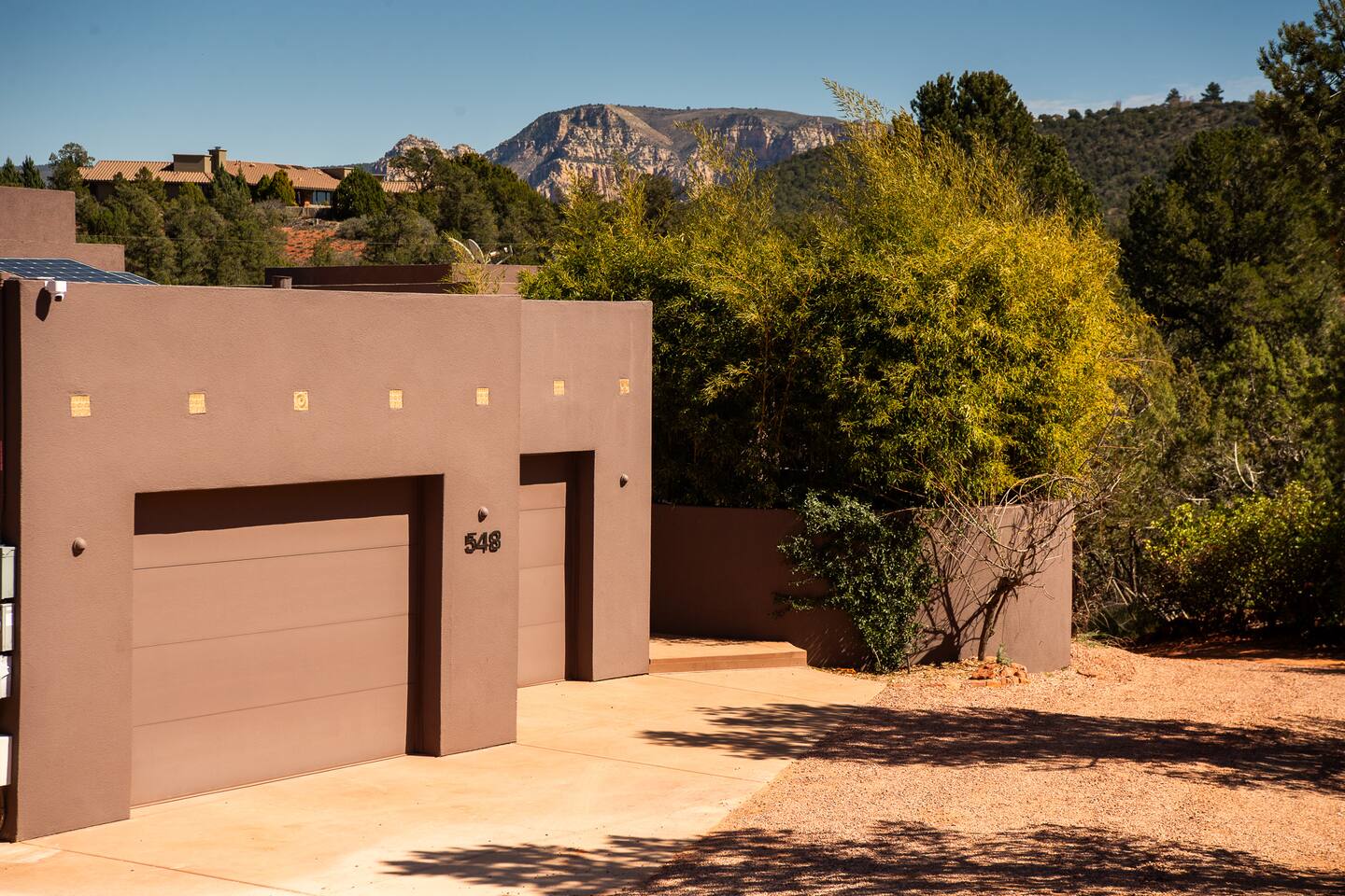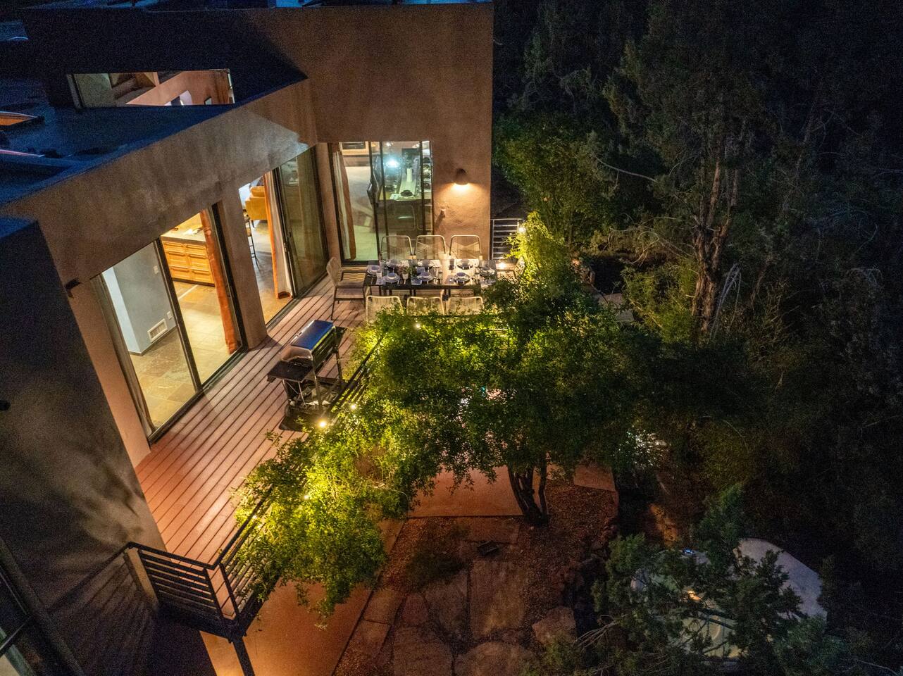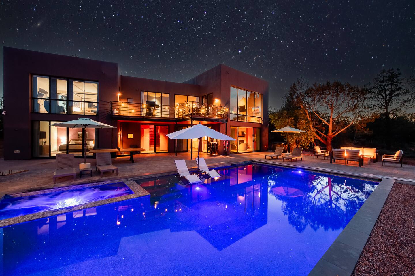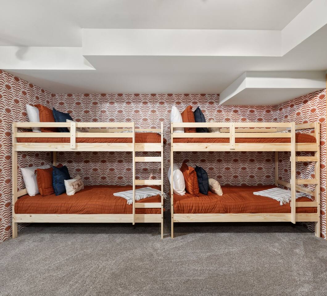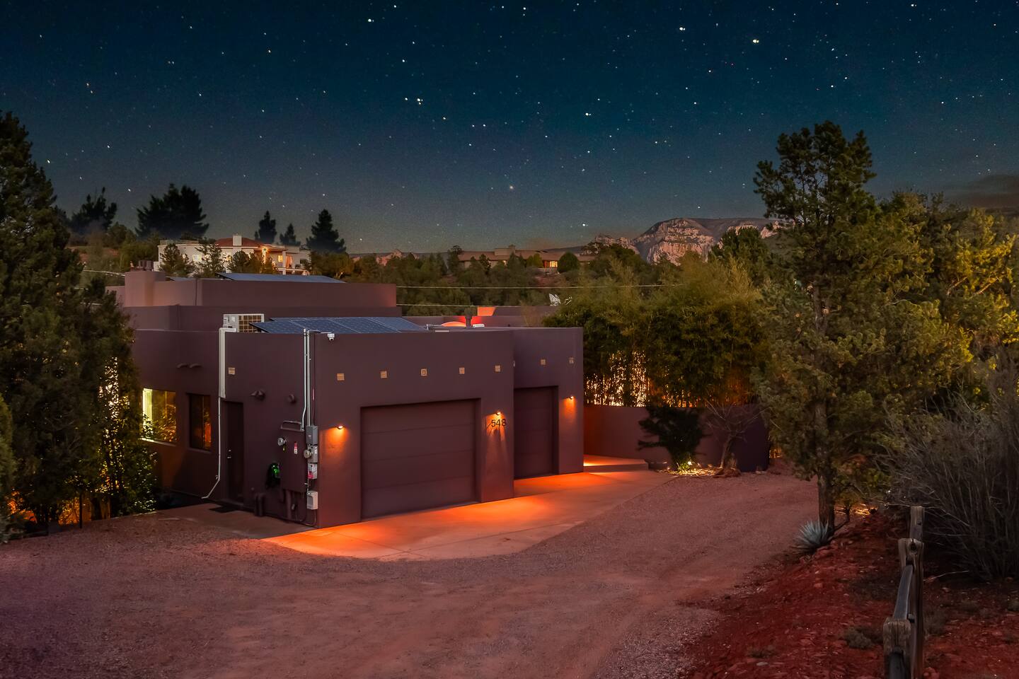 ***EXTERIOR HIGHLIGHTS*** 🏊 Brand New 20'x35' Luxury Heated Saltwater Pool & Spa — Featuring a sun shelf, basketball hoop, and rinse shower! Year round heating available for $100–$150/day – see FAQs for details. Plenty of hardscape area for yoga, meditation, healing, and wellness activities 🌲 Large and private 1-acre wooded lot with a natural desert wash and breathtaking views 🥾 Direct access to a well-maintained trail system right from the backyard ♨️ Authentic cedar cube sauna seats 4-6 🏗️ Pergola and shaded lounge furniture 🔥 2 Cozy gas fire features with Adirondack chairs or soft seating - perfect for desert evenings 🏓 Ping pong table and cornhole. The ping pong tables doubles as a dining table - 12 chairs provided 🍽️ Scenic view deck off the main kitchen with dining for 7 ☕ Private bistro deck off bedroom 2 — ideal for morning coffee or intimate dining for 2 🍽️ Covered patio adjacent to walkout basement with dining for 12 🍖 BBQ grill with complimentary propane 🔌 Stage two EV charger (see FAQs for details) 🌌 Located in a Certified Dark Sky community — ideal for world-class stargazing 🦌 Wildlife: bobcats, jack rabbits, mule deer, owls, javelinas, lizards, and more! ***INTERIOR HIGHLIGHTS*** 🏠 Over 4,000 sq ft of designer-appointed space with stunning floor-to-ceiling windows 🎱 Awesome game room with dual sim racer video game system, pool table, shuffleboard, foosball, and board games! 💺 Massage chair in primary bedroom and heated tile floors in the two ensuite bathrooms 🏋️ Exercise room with swiveling wall-mount bike rack (accommodates 4 large mountain bikes), 3 cushioned yoga mats, exercise ball, bench, dumbells, kettlebells, and a Power Tower 🛋️ Two spacious living rooms with gas fireplaces, smart TVs, and panoramic red rock views 🍽️ Dining for 14 on the main level + 8 more on the lower level — ideal for large groups 🛏️ Uniquely styled bedrooms with memory foam mattresses, smart TVs, and expansive windows 🎮 Bunk room with retro arcade games, smart TV, and reading nook 👨🍳 Fully equipped, chef-ready kitchen on the main level plus a kitchenette with large countertop bar and seating in the basement 🧺 Full laundry with a second dryer for extended stays 🐾 Pets allowed (max of 2 dogs — you must notify host before bringing pets to obtain pre-approval. Please be sure to clean up after your pets. See FAQs for pet details) 🌱 Eco-friendly construction with solar panels, low-VOC materials, and energy-efficient systems ⚡ Fast & Free WiFi MAIN LIVING AREAS: Featuring an open concept with a gas fireplace, full window wall, colorful paint palette, and stunning views of the red rocks, the living room has direct access to two separate decks. The lower level living room also has a fireplace and full glass wall with direct access to the backyard patio and pool area via large sliding glass doors for true indoor/outdoor living. KITCHENS: You'll have everything you need for preparing meals for large groups. In addition to all the standard appliances and kitchen essentials, there's a Keurig with pods provided, blender, filtered water, basic spices, olive oil, dish soap, trash liners, paper towels, dish sponge, cookie sheets, baking dishes, cutting board, mixing bowls, colander, serving bowls/plates, cheese grater, pitcher, wine bottle opener, can opener, pots & pans, measuring cups, spatulas, ladle, whisk, pizza cutter, and more. PRIMARY BEDROOM: This luxurious ensuite bedroom features a king memory foam bed and abundant natural light with a full glass view wall and a massage chair. The bathroom has a custom walk-in mosaic shower with dual shower heads, dual vanities, a huge closet, and a jetted tub. BEDROOM 2: Located on the main level, this bedroom has a king memory foam bed, smart TV, and floor-to-ceiling windows with access to a private deck with seating for 2. The bathroom is accessed through the adjacent hallway. BEDROOM 3: Located on the lower level, this ensuite bedroom features 2 memory foam queen beds and a smart TV with a sliding glass door to access the back yard. The bathroom has double vanities, a tub/shower, and a huge walk-in closet BEDROOM 4: Located on the lower level, this bedroom features a king memory foam bed and floor-to ceiling windows with access to the pool/patio via a sliding glass door. The bathroom has a walk-in shower and is shared with the bedroom 5 (bunk room) and can be isolated from the rest of the home to make a private unit using the keypad lock in the hallway if desired. BEDROOM 5: Located adjacent to bedroom 4 is the bunk room, complete with 2 bunk beds, a smart TV, an arcade console, and a reading nook. PRIVATE BACKYARD OASIS: Recline on the comfortable loungers by the expansive 35’x20’ heated pool complete with basketball hoop, baja lounge shelf, large paver deck with a pergola and gas firepit, a rinse-off shower, and colorful LED night lighting. GAME ROOM: Features a full desert mural on all four walls and the ceiling. There's something for everyone with board games, pool table, shuffleboard, foosball, and sim racing style video games on Xbox like Forza Horizon 5. The sim racing setup includes two cockpits for head-to-head racing. Each cockpit has it's own realistic racing seat, steering wheel, and pedals + noise canceling headphones and a 55" TV so that you can zero in on smokin' the competition! EXERCISE ROOM: You won't have to miss a workout while you're visiting Sedona - just visit the "Desert Gains" gym! Equipment includes an exercise ball, cushioned mats, bench, dumbells, and kettlebells. Use the Power Tower for pull-ups, dips, leg raises, pushups, calf raises, and more. Other things to note: Maintenance personnel performing pest control services, spa maintenance, filter changes, and other light maintenance tasks will occasionally need access to the property. They may show up during normal business hours without notice and will knock and ring the d
