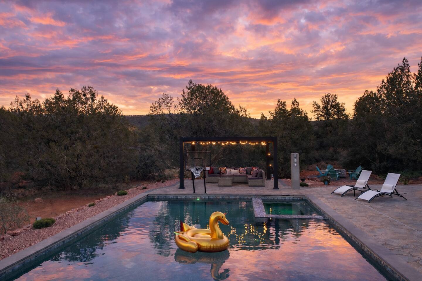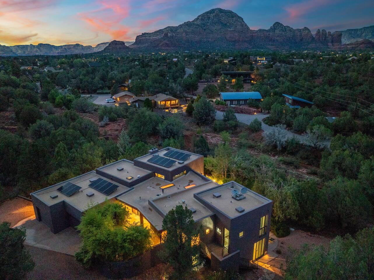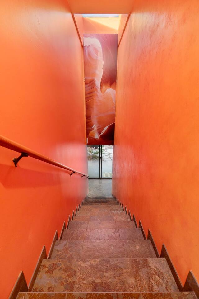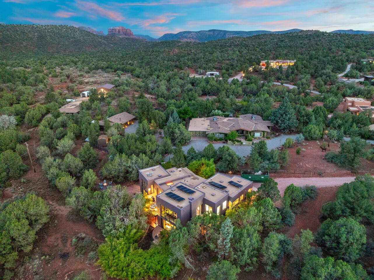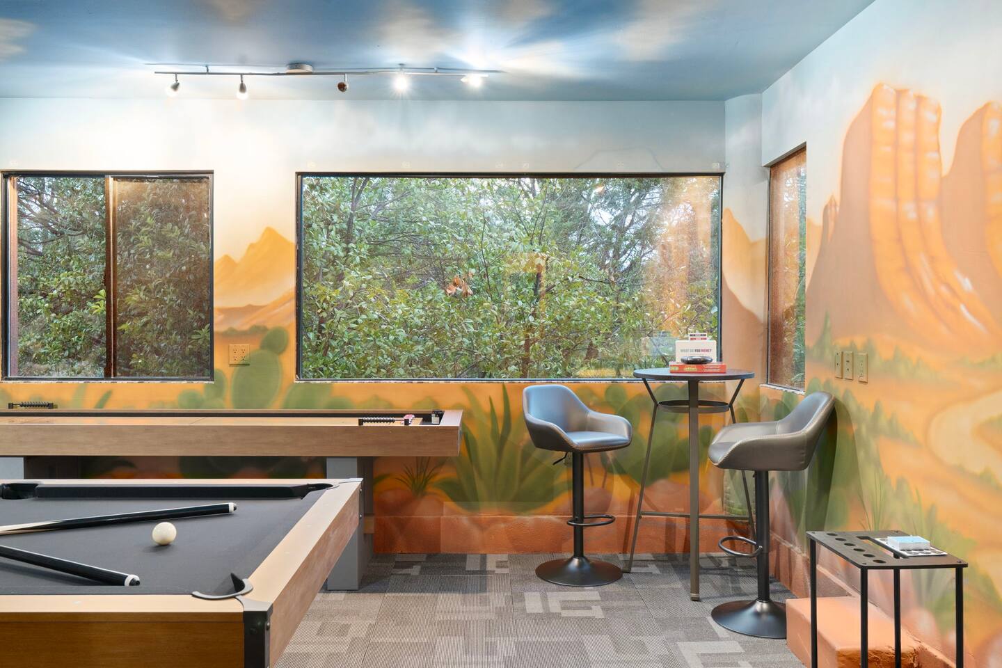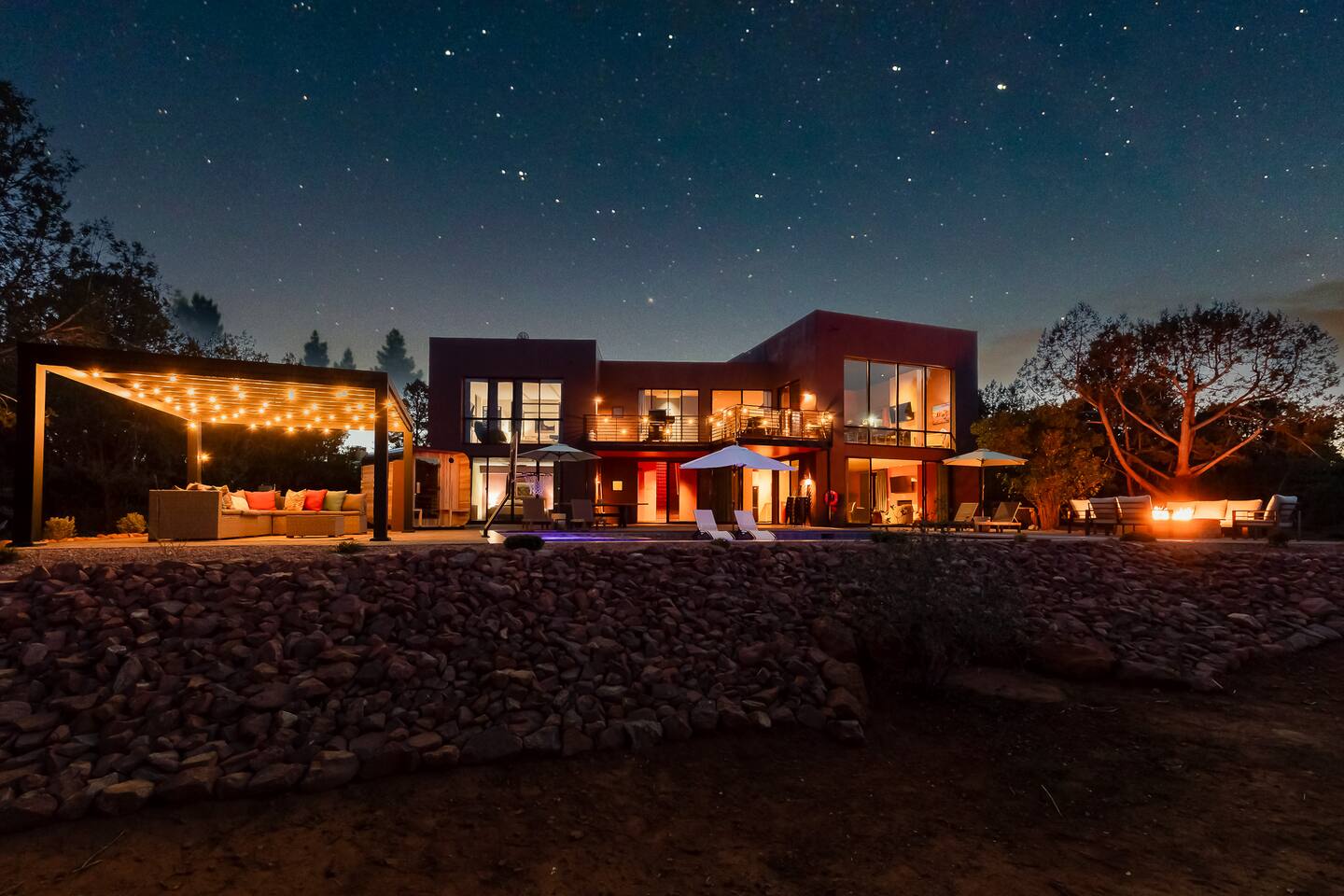 ***EXTERIOR HIGHLIGHTS*** 🏊 Brand New 20'x35' Luxury Heated Saltwater Pool & Spa — Featuring a sun shelf, basketball hoop, and rinse shower! Year round heating available for $100–$150/day – see FAQs for details. Plenty of hardscape area for yoga, meditation, healing, and wellness activities 🌲 Large and private 1-acre wooded lot with a natural desert wash and breathtaking views 🥾 Direct access to a well-maintained trail system right from the backyard ♨️ Authentic cedar cube sauna seats 4-6 🏗️ Pergola and shaded lounge furniture 🔥 2 Cozy gas fire features with Adirondack chairs or soft seating - perfect for desert evenings 🏓 Ping pong table and cornhole. The ping pong tables doubles as a dining table - 12 chairs provided 🍽️ Scenic view deck off the main kitchen with dining for 7 ☕ Private bistro deck off bedroom 2 — ideal for morning coffee or intimate dining for 2 🍽️ Covered patio adjacent to walkout basement with dining for 12 🍖 BBQ grill with complimentary propane 🔌 Stage two EV charger (see FAQs for details) 🌌 Located in a Certified Dark Sky community — ideal for world-class stargazing 🦌 Wildlife: bobcats, jack rabbits, mule deer, owls, javelinas, lizards, and more! ***INTERIOR HIGHLIGHTS*** 🏠 Over 4,000 sq ft of designer-appointed space with stunning floor-to-ceiling windows 🎱 Awesome game room with dual sim racer video game system, pool table, shuffleboard, foosball, and board games! 💺 Massage chair in primary bedroom and heated tile floors in the two ensuite bathrooms 🏋️ Exercise room with swiveling wall-mount bike rack (accommodates 4 large mountain bikes), 3 cushioned yoga mats, exercise ball, bench, dumbells, kettlebells, and a Power Tower 🛋️ Two spacious living rooms with gas fireplaces, smart TVs, and panoramic red rock views 🍽️ Dining for 14 on the main level + 8 more on the lower level — ideal for large groups 🛏️ Uniquely styled bedrooms with memory foam mattresses, smart TVs, and expansive windows 🎮 Bunk room with retro arcade games, smart TV, and reading nook 👨🍳 Fully equipped, chef-ready kitchen on the main level plus a kitchenette with large countertop bar and seating in the basement 🧺 Full laundry with a second dryer for extended stays 🐾 Pets allowed (max of 2 dogs — you must notify host before bringing pets to obtain pre-approval. Please be sure to clean up after your pets. See FAQs for pet details) 🌱 Eco-friendly construction with solar panels, low-VOC materials, and energy-efficient systems ⚡ Fast & Free WiFi MAIN LIVING AREAS: Featuring an open concept with a gas fireplace, full window wall, colorful paint palette, and stunning views of the red rocks, the living room has direct access to two separate decks. The lower level living room also has a fireplace and full glass wall with direct access to the backyard patio and pool area via large sliding glass doors for true indoor/outdoor living. KITCHENS: You'll have everything you need for preparing meals for large groups. In addition to all the standard appliances and kitchen essentials, there's a Keurig with pods provided, blender, filtered water, basic spices, olive oil, dish soap, trash liners, paper towels, dish sponge, cookie sheets, baking dishes, cutting board, mixing bowls, colander, serving bowls/plates, cheese grater, pitcher, wine bottle opener, can opener, pots & pans, measuring cups, spatulas, ladle, whisk, pizza cutter, and more. PRIMARY BEDROOM: This luxurious ensuite bedroom features a king memory foam bed and abundant natural light with a full glass view wall and a massage chair. The bathroom has a custom walk-in mosaic shower with dual shower heads, dual vanities, a huge closet, and a jetted tub. BEDROOM 2: Located on the main level, this bedroom has a king memory foam bed, smart TV, and floor-to-ceiling windows with access to a private deck with seating for 2. The bathroom is accessed through the adjacent hallway. BEDROOM 3: Located on the lower level, this ensuite bedroom features 2 memory foam queen beds and a smart TV with a sliding glass door to access the back yard. The bathroom has double vanities, a tub/shower, and a huge walk-in closet BEDROOM 4: Located on the lower level, this bedroom features a king memory foam bed and floor-to ceiling windows with access to the pool/patio via a sliding glass door. The bathroom has a walk-in shower and is shared with the bedroom 5 (bunk room) and can be isolated from the rest of the home to make a private unit using the keypad lock in the hallway if desired. BEDROOM 5: Located adjacent to bedroom 4 is the bunk room, complete with 2 bunk beds, a smart TV, an arcade console, and a reading nook. PRIVATE BACKYARD OASIS: Recline on the comfortable loungers by the expansive 35’x20’ heated pool complete with basketball hoop, baja lounge shelf, large paver deck with a pergola and gas firepit, a rinse-off shower, and colorful LED night lighting. GAME ROOM: Features a full desert mural on all four walls and the ceiling. There's something for everyone with board games, pool table, shuffleboard, foosball, and sim racing style video games on Xbox like Forza Horizon 5. The sim racing setup includes two cockpits for head-to-head racing. Each cockpit has it's own realistic racing seat, steering wheel, and pedals + noise canceling headphones and a 55" TV so that you can zero in on smokin' the competition! EXERCISE ROOM: You won't have to miss a workout while you're visiting Sedona - just visit the "Desert Gains" gym! Equipment includes an exercise ball, cushioned mats, bench, dumbells, and kettlebells. Use the Power Tower for pull-ups, dips, leg raises, pushups, calf raises, and more. Other things to note: Maintenance personnel performing pest control services, spa maintenance, filter changes, and other light maintenance tasks will occasionally need access to the property. They may show up during normal business hours without notice and will knock and ring the d