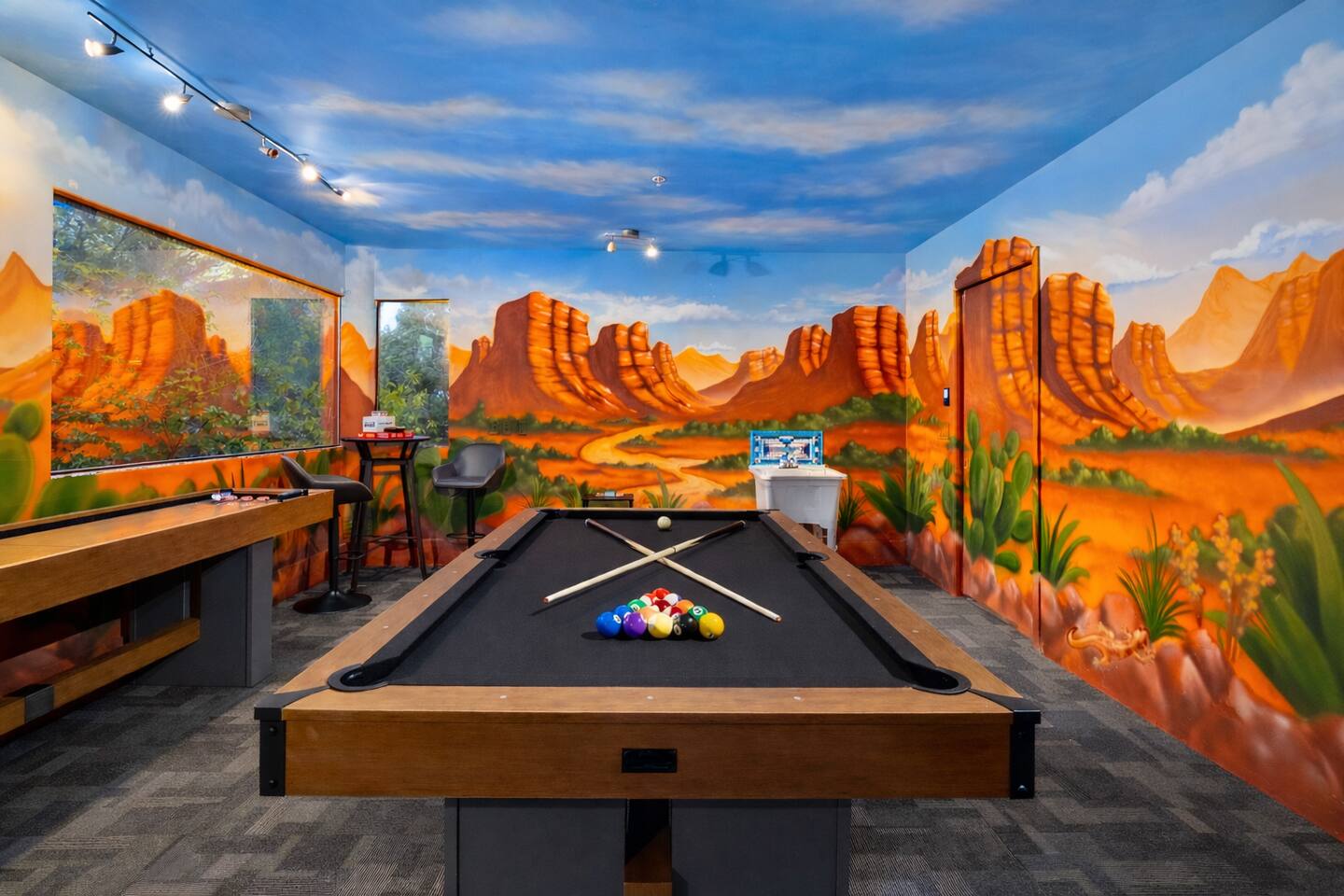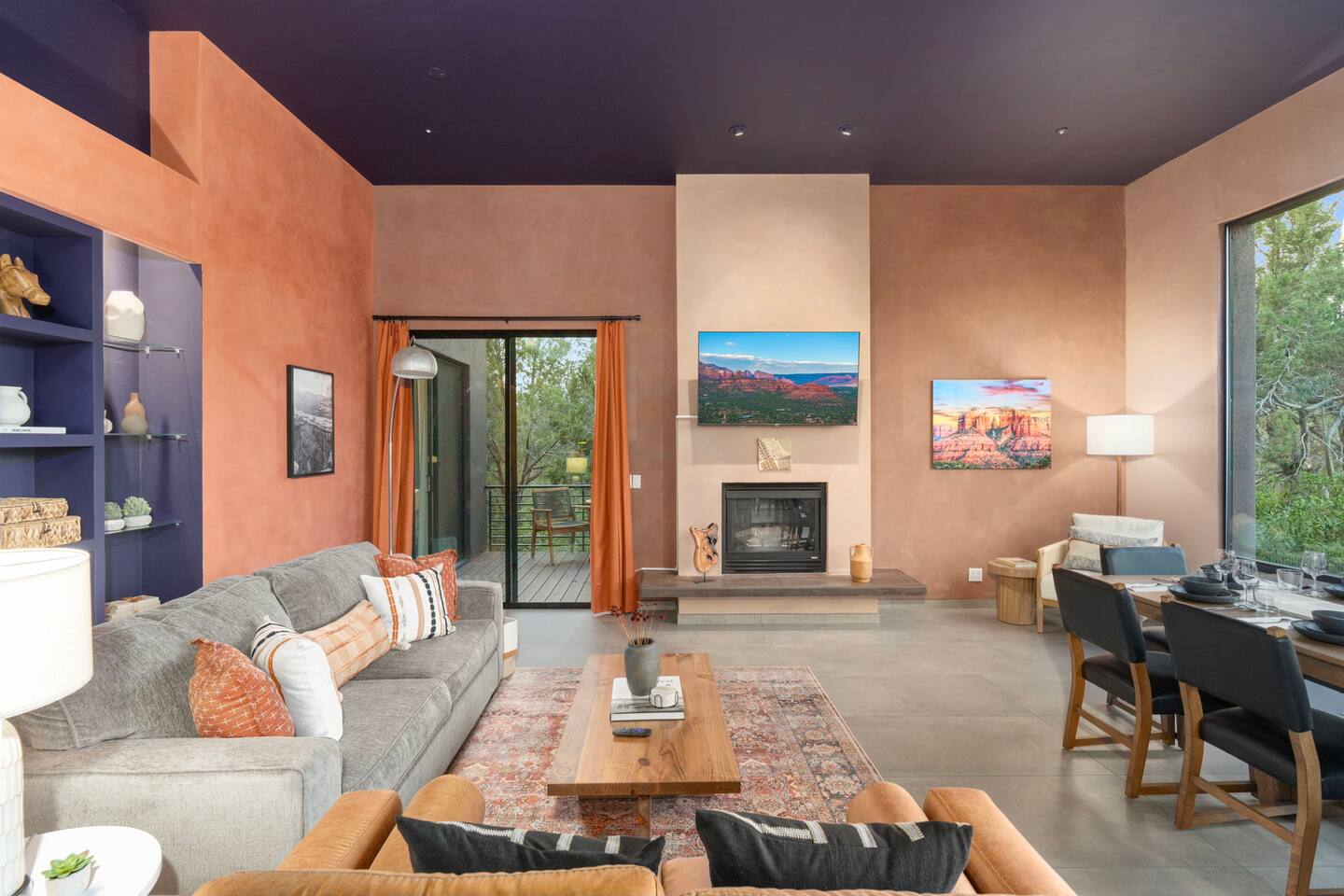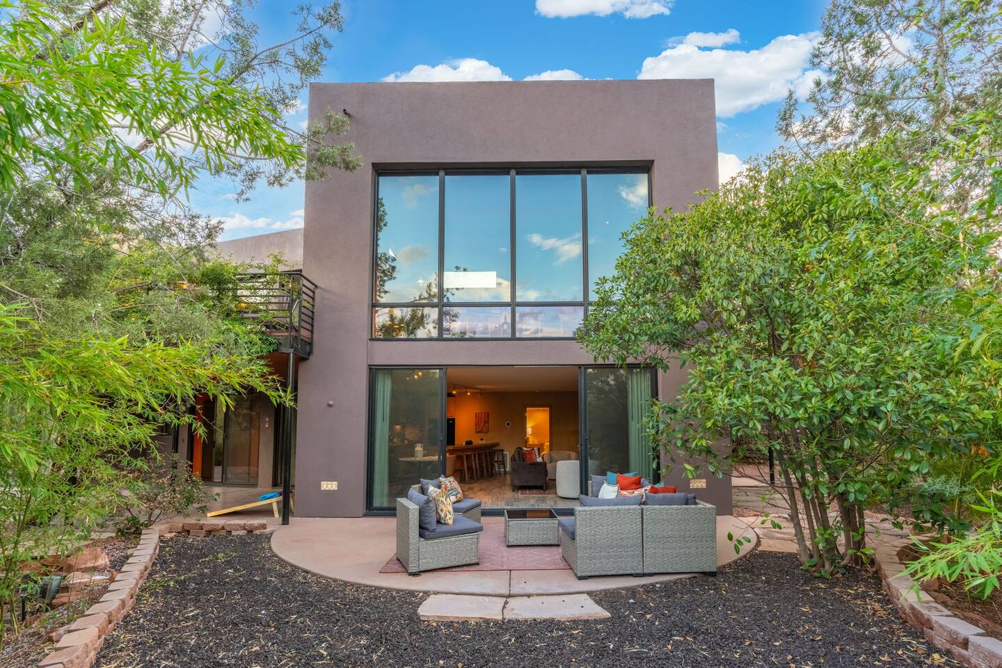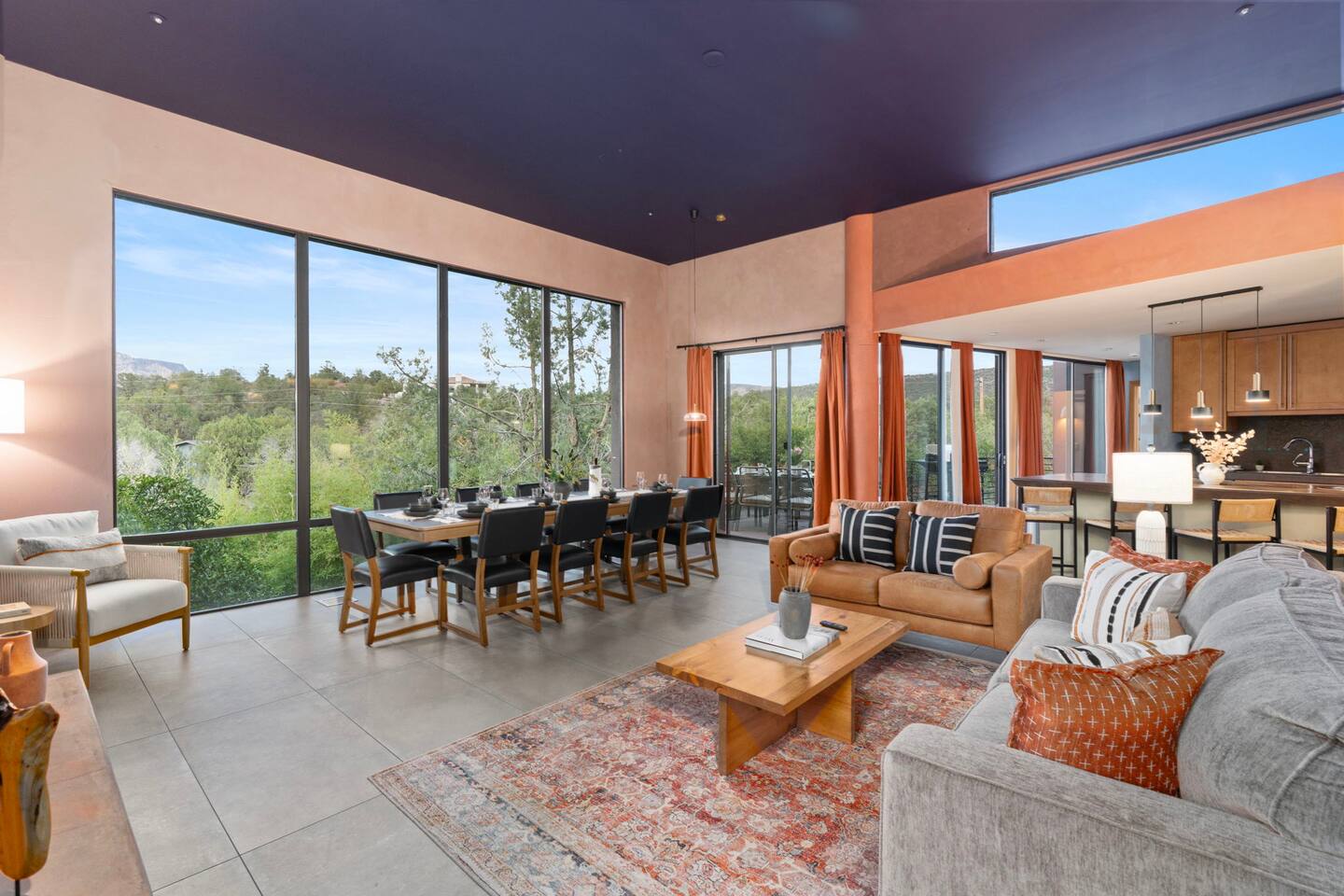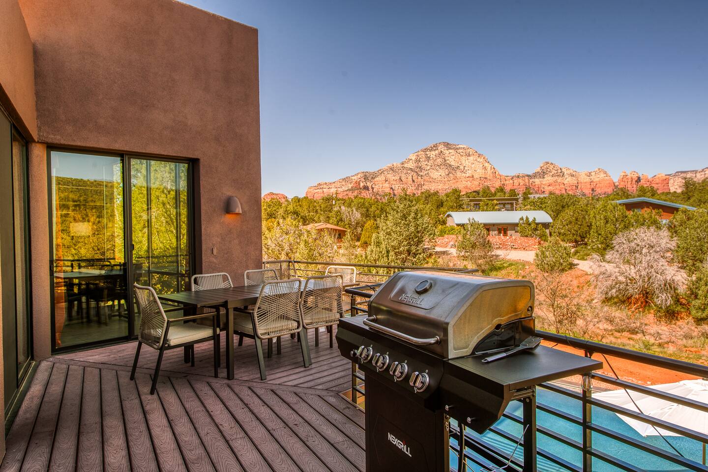 ***EXTERIOR HIGHLIGHTS*** 🏊 Brand New 20'x35' Luxury Heated Saltwater Pool & Spa — Featuring a sun shelf, basketball hoop, and rinse shower! Year round heating available for $100–$150/day – see FAQs for details. Plenty of hardscape area for yoga, meditation, healing, and wellness activities 🌲 Large and private 1-acre wooded lot with a natural desert wash and breathtaking views 🥾 Direct access to a well-maintained trail system right from the backyard ♨️ Authentic cedar cube sauna seats 4-6 🏗️ Pergola and shaded lounge furniture 🔥 2 Cozy gas fire features with Adirondack chairs or soft seating - perfect for desert evenings 🏓 Ping pong table and cornhole. The ping pong tables doubles as a dining table - 12 chairs provided 🍽️ Scenic view deck off the main kitchen with dining for 7 ☕ Private bistro deck off bedroom 2 — ideal for morning coffee or intimate dining for 2 🍽️ Covered patio adjacent to walkout basement with dining for 12 🍖 BBQ grill with complimentary propane 🔌 Stage two EV charger (see FAQs for details) 🌌 Located in a Certified Dark Sky community — ideal for world-class stargazing 🦌 Wildlife: bobcats, jack rabbits, mule deer, owls, javelinas, lizards, and more! ***INTERIOR HIGHLIGHTS*** 🏠 Over 4,000 sq ft of designer-appointed space with stunning floor-to-ceiling windows 🎱 Awesome game room with dual sim racer video game system, pool table, shuffleboard, foosball, and board games! 💺 Massage chair in primary bedroom and heated tile floors in the two ensuite bathrooms 🏋️ Exercise room with swiveling wall-mount bike rack (accommodates 4 large mountain bikes), 3 cushioned yoga mats, exercise ball, bench, dumbells, kettlebells, and a Power Tower 🛋️ Two spacious living rooms with gas fireplaces, smart TVs, and panoramic red rock views 🍽️ Dining for 14 on the main level + 8 more on the lower level — ideal for large groups 🛏️ Uniquely styled bedrooms with memory foam mattresses, smart TVs, and expansive windows 🎮 Bunk room with retro arcade games, smart TV, and reading nook 👨🍳 Fully equipped, chef-ready kitchen on the main level plus a kitchenette with large countertop bar and seating in the basement 🧺 Full laundry with a second dryer for extended stays 🐾 Pets allowed (max of 2 dogs — you must notify host before bringing pets to obtain pre-approval. Please be sure to clean up after your pets. See FAQs for pet details) 🌱 Eco-friendly construction with solar panels, low-VOC materials, and energy-efficient systems ⚡ Fast & Free WiFi MAIN LIVING AREAS: Featuring an open concept with a gas fireplace, full window wall, colorful paint palette, and stunning views of the red rocks, the living room has direct access to two separate decks. The lower level living room also has a fireplace and full glass wall with direct access to the backyard patio and pool area via large sliding glass doors for true indoor/outdoor living. KITCHENS: You'll have everything you need for preparing meals for large groups. In addition to all the standard appliances and kitchen essentials, there's a Keurig with pods provided, blender, filtered water, basic spices, olive oil, dish soap, trash liners, paper towels, dish sponge, cookie sheets, baking dishes, cutting board, mixing bowls, colander, serving bowls/plates, cheese grater, pitcher, wine bottle opener, can opener, pots & pans, measuring cups, spatulas, ladle, whisk, pizza cutter, and more. PRIMARY BEDROOM: This luxurious ensuite bedroom features a king memory foam bed and abundant natural light with a full glass view wall and a massage chair. The bathroom has a custom walk-in mosaic shower with dual shower heads, dual vanities, a huge closet, and a jetted tub. BEDROOM 2: Located on the main level, this bedroom has a king memory foam bed, smart TV, and floor-to-ceiling windows with access to a private deck with seating for 2. The bathroom is accessed through the adjacent hallway. BEDROOM 3: Located on the lower level, this ensuite bedroom features 2 memory foam queen beds and a smart TV with a sliding glass door to access the back yard. The bathroom has double vanities, a tub/shower, and a huge walk-in closet BEDROOM 4: Located on the lower level, this bedroom features a king memory foam bed and floor-to ceiling windows with access to the pool/patio via a sliding glass door. The bathroom has a walk-in shower and is shared with the bedroom 5 (bunk room) and can be isolated from the rest of the home to make a private unit using the keypad lock in the hallway if desired. BEDROOM 5: Located adjacent to bedroom 4 is the bunk room, complete with 2 bunk beds, a smart TV, an arcade console, and a reading nook. PRIVATE BACKYARD OASIS: Recline on the comfortable loungers by the expansive 35’x20’ heated pool complete with basketball hoop, baja lounge shelf, large paver deck with a pergola and gas firepit, a rinse-off shower, and colorful LED night lighting. GAME ROOM: Features a full desert mural on all four walls and the ceiling. There's something for everyone with board games, pool table, shuffleboard, foosball, and sim racing style video games on Xbox like Forza Horizon 5. The sim racing setup includes two cockpits for head-to-head racing. Each cockpit has it's own realistic racing seat, steering wheel, and pedals + noise canceling headphones and a 55" TV so that you can zero in on smokin' the competition! EXERCISE ROOM: You won't have to miss a workout while you're visiting Sedona - just visit the "Desert Gains" gym! Equipment includes an exercise ball, cushioned mats, bench, dumbells, and kettlebells. Use the Power Tower for pull-ups, dips, leg raises, pushups, calf raises, and more. Other things to note: Maintenance personnel performing pest control services, spa maintenance, filter changes, and other light maintenance tasks will occasionally need access to the property. They may show up during normal business hours without notice and will knock and ring the d