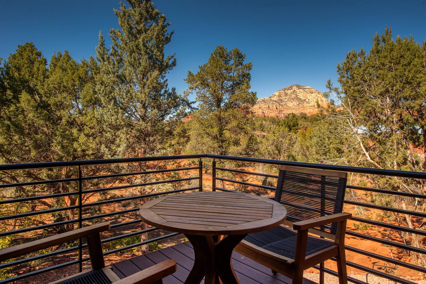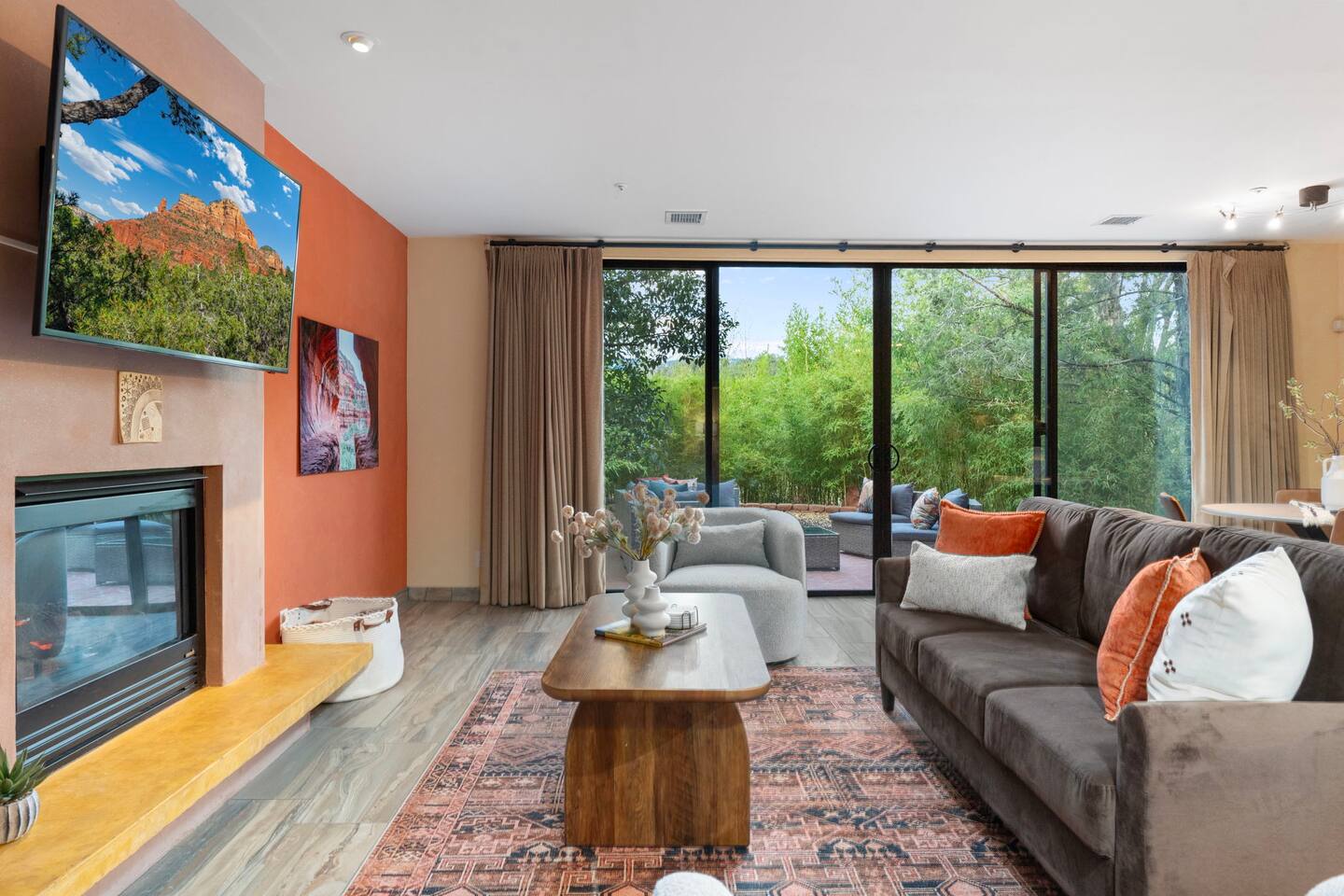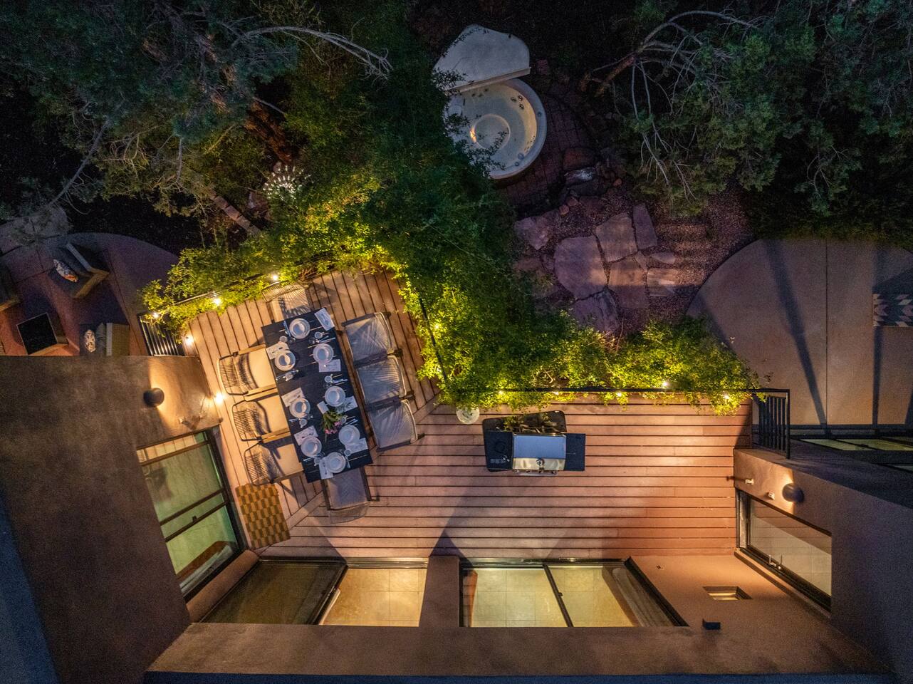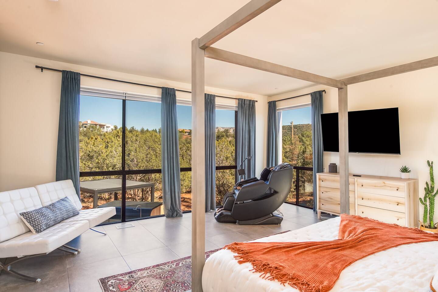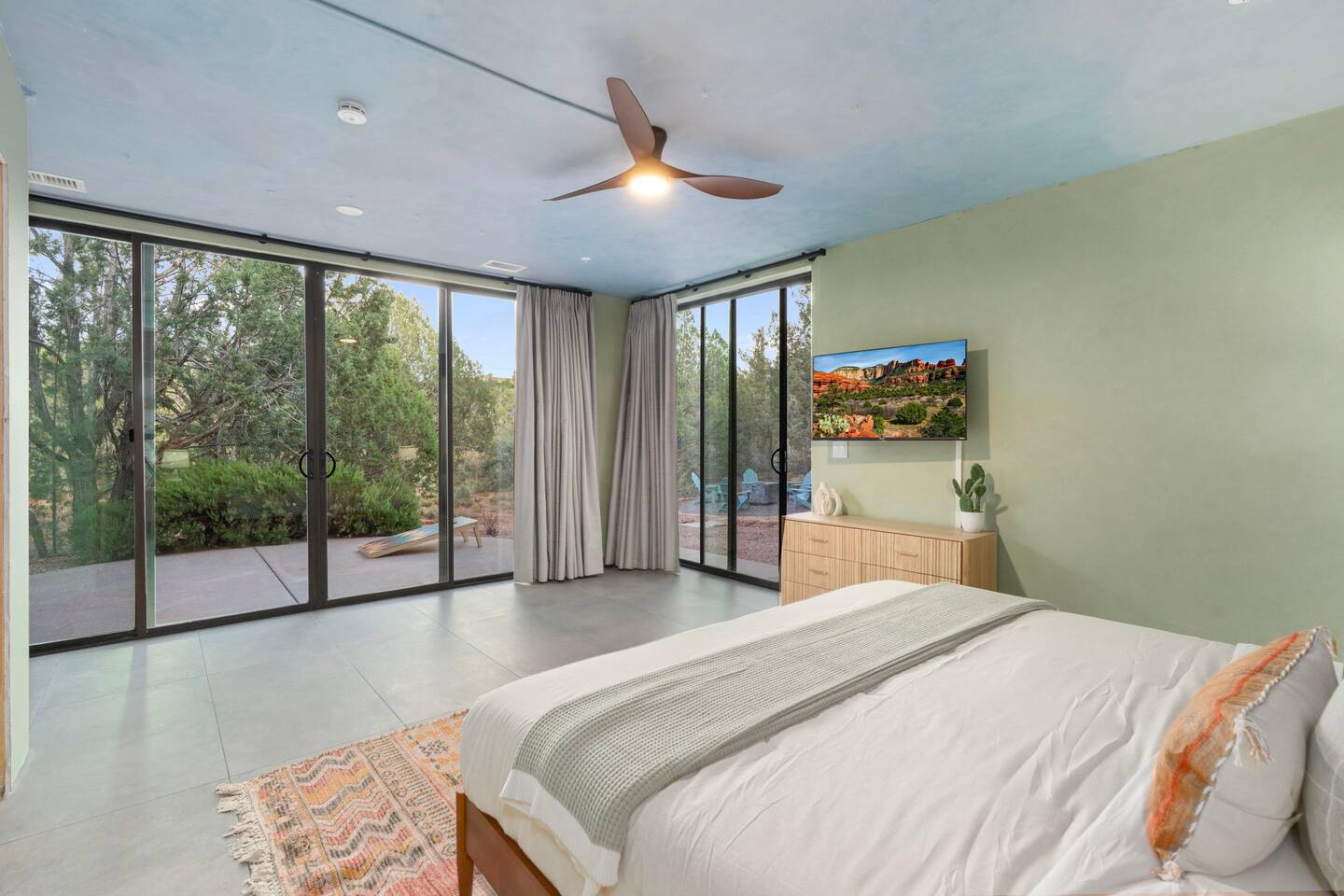 ***EXTERIOR HIGHLIGHTS*** 🏊 Brand New 20'x35' Luxury Heated Saltwater Pool & Spa — Featuring a sun shelf, basketball hoop, and rinse shower! Year round heating available for $100–$150/day – see FAQs for details. Plenty of hardscape area for yoga, meditation, healing, and wellness activities 🌲 Large and private 1-acre wooded lot with a natural desert wash and breathtaking views 🥾 Direct access to a well-maintained trail system right from the backyard ♨️ Authentic cedar cube sauna seats 4-6 🏗️ Pergola and shaded lounge furniture 🔥 2 Cozy gas fire features with Adirondack chairs or soft seating - perfect for desert evenings 🏓 Ping pong table and cornhole. The ping pong tables doubles as a dining table - 12 chairs provided 🍽️ Scenic view deck off the main kitchen with dining for 7 ☕ Private bistro deck off bedroom 2 — ideal for morning coffee or intimate dining for 2 🍽️ Covered patio adjacent to walkout basement with dining for 12 🍖 BBQ grill with complimentary propane 🔌 Stage two EV charger (see FAQs for details) 🌌 Located in a Certified Dark Sky community — ideal for world-class stargazing 🦌 Wildlife: bobcats, jack rabbits, mule deer, owls, javelinas, lizards, and more! ***INTERIOR HIGHLIGHTS*** 🏠 Over 4,000 sq ft of designer-appointed space with stunning floor-to-ceiling windows 🎱 Awesome game room with dual sim racer video game system, pool table, shuffleboard, foosball, and board games! 💺 Massage chair in primary bedroom and heated tile floors in the two ensuite bathrooms 🏋️ Exercise room with swiveling wall-mount bike rack (accommodates 4 large mountain bikes), 3 cushioned yoga mats, exercise ball, bench, dumbells, kettlebells, and a Power Tower 🛋️ Two spacious living rooms with gas fireplaces, smart TVs, and panoramic red rock views 🍽️ Dining for 14 on the main level + 8 more on the lower level — ideal for large groups 🛏️ Uniquely styled bedrooms with memory foam mattresses, smart TVs, and expansive windows 🎮 Bunk room with retro arcade games, smart TV, and reading nook 👨🍳 Fully equipped, chef-ready kitchen on the main level plus a kitchenette with large countertop bar and seating in the basement 🧺 Full laundry with a second dryer for extended stays 🐾 Pets allowed (max of 2 dogs — you must notify host before bringing pets to obtain pre-approval. Please be sure to clean up after your pets. See FAQs for pet details) 🌱 Eco-friendly construction with solar panels, low-VOC materials, and energy-efficient systems ⚡ Fast & Free WiFi MAIN LIVING AREAS: Featuring an open concept with a gas fireplace, full window wall, colorful paint palette, and stunning views of the red rocks, the living room has direct access to two separate decks. The lower level living room also has a fireplace and full glass wall with direct access to the backyard patio and pool area via large sliding glass doors for true indoor/outdoor living. KITCHENS: You'll have everything you need for preparing meals for large groups. In addition to all the standard appliances and kitchen essentials, there's a Keurig with pods provided, blender, filtered water, basic spices, olive oil, dish soap, trash liners, paper towels, dish sponge, cookie sheets, baking dishes, cutting board, mixing bowls, colander, serving bowls/plates, cheese grater, pitcher, wine bottle opener, can opener, pots & pans, measuring cups, spatulas, ladle, whisk, pizza cutter, and more. PRIMARY BEDROOM: This luxurious ensuite bedroom features a king memory foam bed and abundant natural light with a full glass view wall and a massage chair. The bathroom has a custom walk-in mosaic shower with dual shower heads, dual vanities, a huge closet, and a jetted tub. BEDROOM 2: Located on the main level, this bedroom has a king memory foam bed, smart TV, and floor-to-ceiling windows with access to a private deck with seating for 2. The bathroom is accessed through the adjacent hallway. BEDROOM 3: Located on the lower level, this ensuite bedroom features 2 memory foam queen beds and a smart TV with a sliding glass door to access the back yard. The bathroom has double vanities, a tub/shower, and a huge walk-in closet BEDROOM 4: Located on the lower level, this bedroom features a king memory foam bed and floor-to ceiling windows with access to the pool/patio via a sliding glass door. The bathroom has a walk-in shower and is shared with the bedroom 5 (bunk room) and can be isolated from the rest of the home to make a private unit using the keypad lock in the hallway if desired. BEDROOM 5: Located adjacent to bedroom 4 is the bunk room, complete with 2 bunk beds, a smart TV, an arcade console, and a reading nook. PRIVATE BACKYARD OASIS: Recline on the comfortable loungers by the expansive 35’x20’ heated pool complete with basketball hoop, baja lounge shelf, large paver deck with a pergola and gas firepit, a rinse-off shower, and colorful LED night lighting. GAME ROOM: Features a full desert mural on all four walls and the ceiling. There's something for everyone with board games, pool table, shuffleboard, foosball, and sim racing style video games on Xbox like Forza Horizon 5. The sim racing setup includes two cockpits for head-to-head racing. Each cockpit has it's own realistic racing seat, steering wheel, and pedals + noise canceling headphones and a 55" TV so that you can zero in on smokin' the competition! EXERCISE ROOM: You won't have to miss a workout while you're visiting Sedona - just visit the "Desert Gains" gym! Equipment includes an exercise ball, cushioned mats, bench, dumbells, and kettlebells. Use the Power Tower for pull-ups, dips, leg raises, pushups, calf raises, and more. Other things to note: Maintenance personnel performing pest control services, spa maintenance, filter changes, and other light maintenance tasks will occasionally need access to the property. They may show up during normal business hours without notice and will knock and ring the d