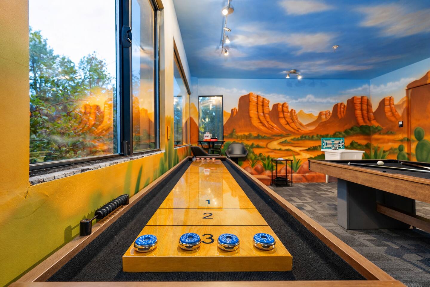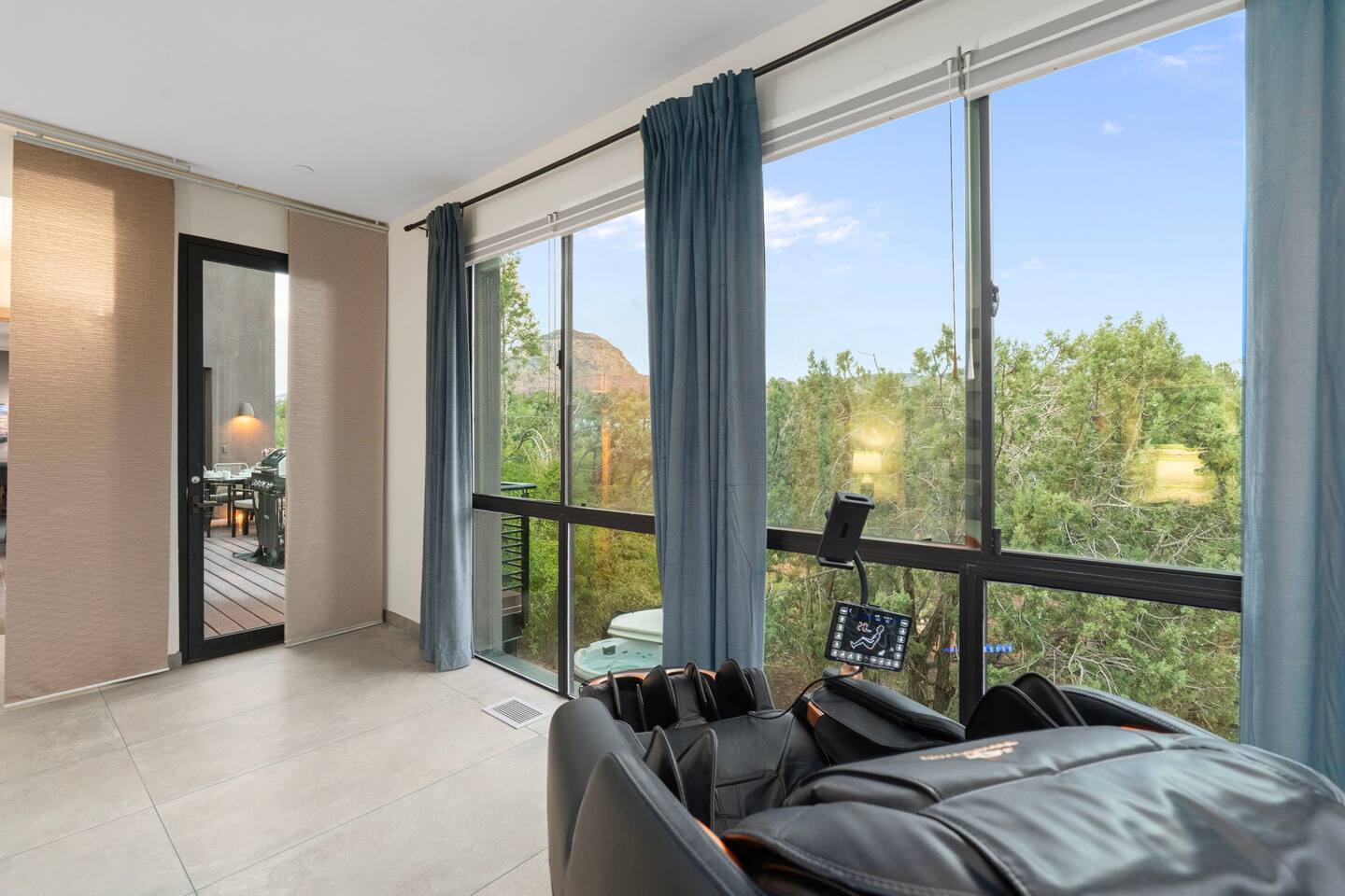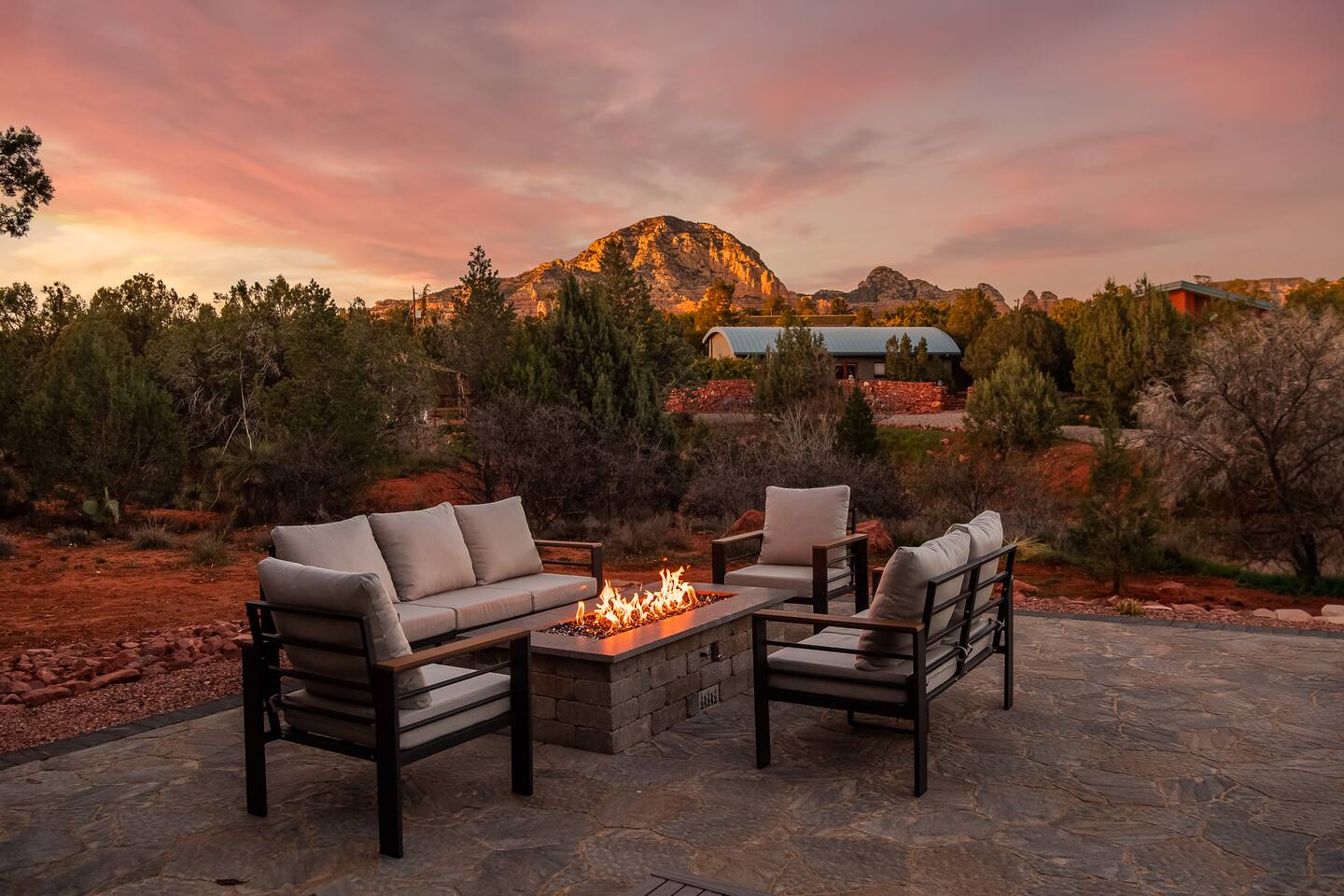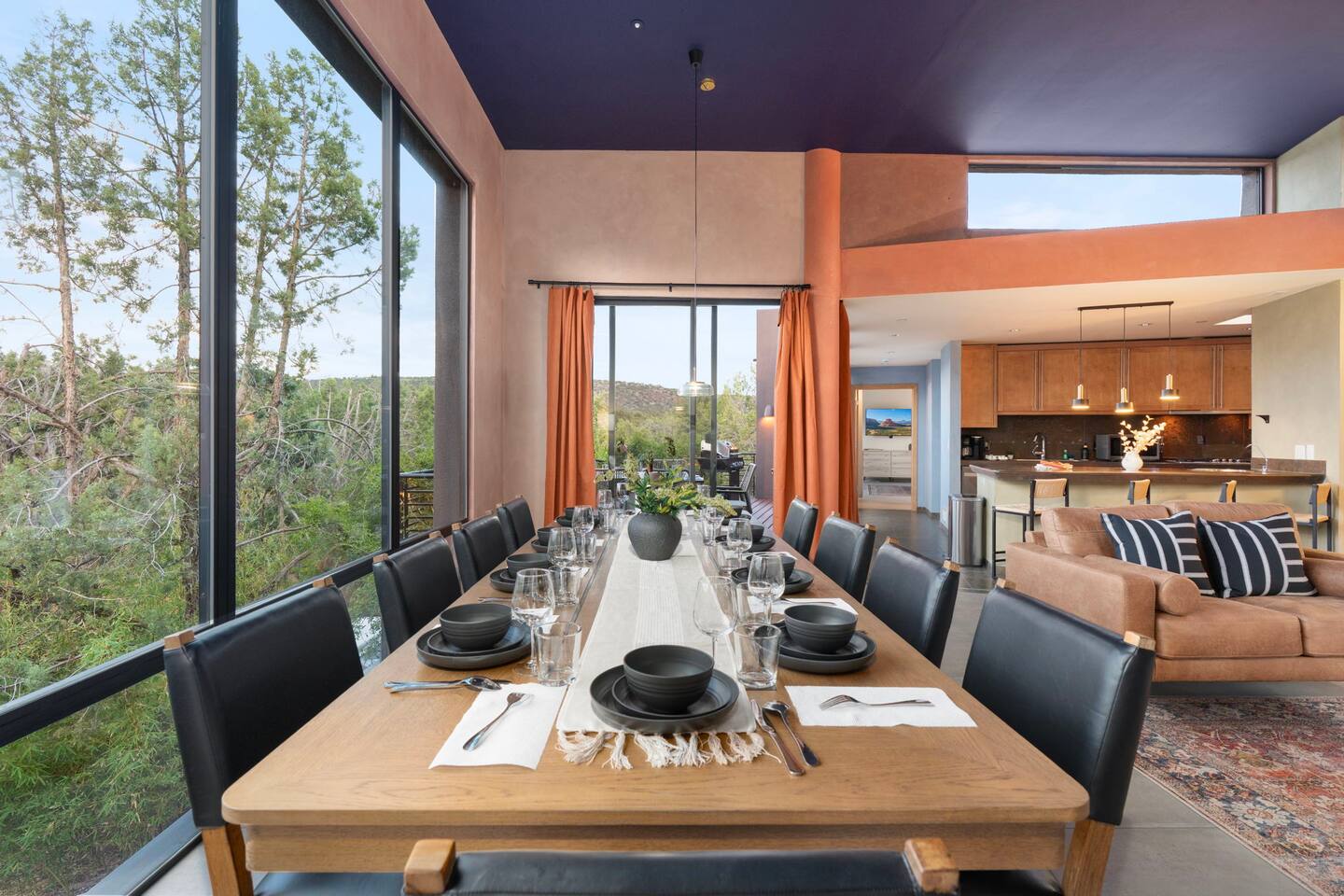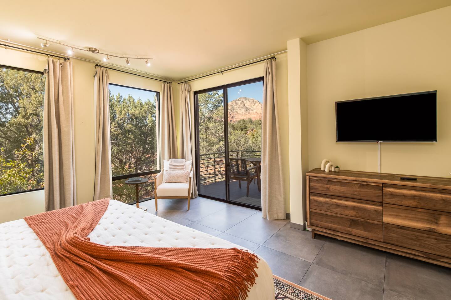 ***EXTERIOR HIGHLIGHTS*** 🏊 Brand New 20'x35' Luxury Heated Saltwater Pool & Spa — Featuring a sun shelf, basketball hoop, and rinse shower! Year round heating available for $100–$150/day – see FAQs for details. Plenty of hardscape area for yoga, meditation, healing, and wellness activities 🌲 Large and private 1-acre wooded lot with a natural desert wash and breathtaking views 🥾 Direct access to a well-maintained trail system right from the backyard ♨️ Authentic cedar cube sauna seats 4-6 🏗️ Pergola and shaded lounge furniture 🔥 2 Cozy gas fire features with Adirondack chairs or soft seating - perfect for desert evenings 🏓 Ping pong table and cornhole. The ping pong tables doubles as a dining table - 12 chairs provided 🍽️ Scenic view deck off the main kitchen with dining for 7 ☕ Private bistro deck off bedroom 2 — ideal for morning coffee or intimate dining for 2 🍽️ Covered patio adjacent to walkout basement with dining for 12 🍖 BBQ grill with complimentary propane 🔌 Stage two EV charger (see FAQs for details) 🌌 Located in a Certified Dark Sky community — ideal for world-class stargazing 🦌 Wildlife: bobcats, jack rabbits, mule deer, owls, javelinas, lizards, and more! ***INTERIOR HIGHLIGHTS*** 🏠 Over 4,000 sq ft of designer-appointed space with stunning floor-to-ceiling windows 🎱 Awesome game room with dual sim racer video game system, pool table, shuffleboard, foosball, and board games! 💺 Massage chair in primary bedroom and heated tile floors in the two ensuite bathrooms 🏋️ Exercise room with swiveling wall-mount bike rack (accommodates 4 large mountain bikes), 3 cushioned yoga mats, exercise ball, bench, dumbells, kettlebells, and a Power Tower 🛋️ Two spacious living rooms with gas fireplaces, smart TVs, and panoramic red rock views 🍽️ Dining for 14 on the main level + 8 more on the lower level — ideal for large groups 🛏️ Uniquely styled bedrooms with memory foam mattresses, smart TVs, and expansive windows 🎮 Bunk room with retro arcade games, smart TV, and reading nook 👨🍳 Fully equipped, chef-ready kitchen on the main level plus a kitchenette with large countertop bar and seating in the basement 🧺 Full laundry with a second dryer for extended stays 🐾 Pets allowed (max of 2 dogs — you must notify host before bringing pets to obtain pre-approval. Please be sure to clean up after your pets. See FAQs for pet details) 🌱 Eco-friendly construction with solar panels, low-VOC materials, and energy-efficient systems ⚡ Fast & Free WiFi MAIN LIVING AREAS: Featuring an open concept with a gas fireplace, full window wall, colorful paint palette, and stunning views of the red rocks, the living room has direct access to two separate decks. The lower level living room also has a fireplace and full glass wall with direct access to the backyard patio and pool area via large sliding glass doors for true indoor/outdoor living. KITCHENS: You'll have everything you need for preparing meals for large groups. In addition to all the standard appliances and kitchen essentials, there's a Keurig with pods provided, blender, filtered water, basic spices, olive oil, dish soap, trash liners, paper towels, dish sponge, cookie sheets, baking dishes, cutting board, mixing bowls, colander, serving bowls/plates, cheese grater, pitcher, wine bottle opener, can opener, pots & pans, measuring cups, spatulas, ladle, whisk, pizza cutter, and more. PRIMARY BEDROOM: This luxurious ensuite bedroom features a king memory foam bed and abundant natural light with a full glass view wall and a massage chair. The bathroom has a custom walk-in mosaic shower with dual shower heads, dual vanities, a huge closet, and a jetted tub. BEDROOM 2: Located on the main level, this bedroom has a king memory foam bed, smart TV, and floor-to-ceiling windows with access to a private deck with seating for 2. The bathroom is accessed through the adjacent hallway. BEDROOM 3: Located on the lower level, this ensuite bedroom features 2 memory foam queen beds and a smart TV with a sliding glass door to access the back yard. The bathroom has double vanities, a tub/shower, and a huge walk-in closet BEDROOM 4: Located on the lower level, this bedroom features a king memory foam bed and floor-to ceiling windows with access to the pool/patio via a sliding glass door. The bathroom has a walk-in shower and is shared with the bedroom 5 (bunk room) and can be isolated from the rest of the home to make a private unit using the keypad lock in the hallway if desired. BEDROOM 5: Located adjacent to bedroom 4 is the bunk room, complete with 2 bunk beds, a smart TV, an arcade console, and a reading nook. PRIVATE BACKYARD OASIS: Recline on the comfortable loungers by the expansive 35’x20’ heated pool complete with basketball hoop, baja lounge shelf, large paver deck with a pergola and gas firepit, a rinse-off shower, and colorful LED night lighting. GAME ROOM: Features a full desert mural on all four walls and the ceiling. There's something for everyone with board games, pool table, shuffleboard, foosball, and sim racing style video games on Xbox like Forza Horizon 5. The sim racing setup includes two cockpits for head-to-head racing. Each cockpit has it's own realistic racing seat, steering wheel, and pedals + noise canceling headphones and a 55" TV so that you can zero in on smokin' the competition! EXERCISE ROOM: You won't have to miss a workout while you're visiting Sedona - just visit the "Desert Gains" gym! Equipment includes an exercise ball, cushioned mats, bench, dumbells, and kettlebells. Use the Power Tower for pull-ups, dips, leg raises, pushups, calf raises, and more. Other things to note: Maintenance personnel performing pest control services, spa maintenance, filter changes, and other light maintenance tasks will occasionally need access to the property. They may show up during normal business hours without notice and will knock and ring the d