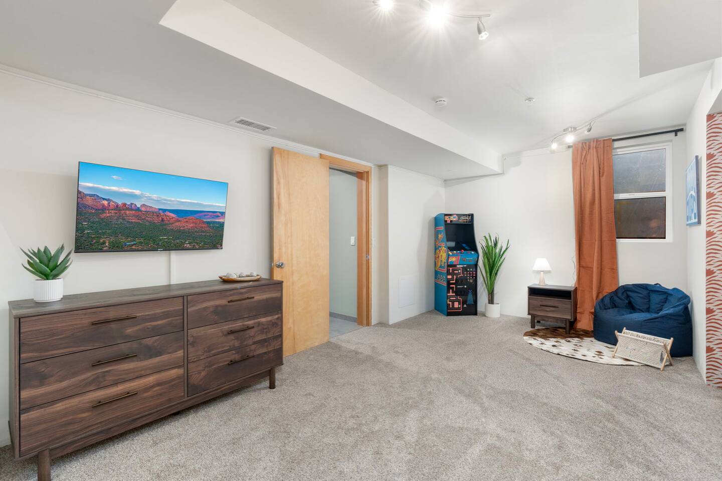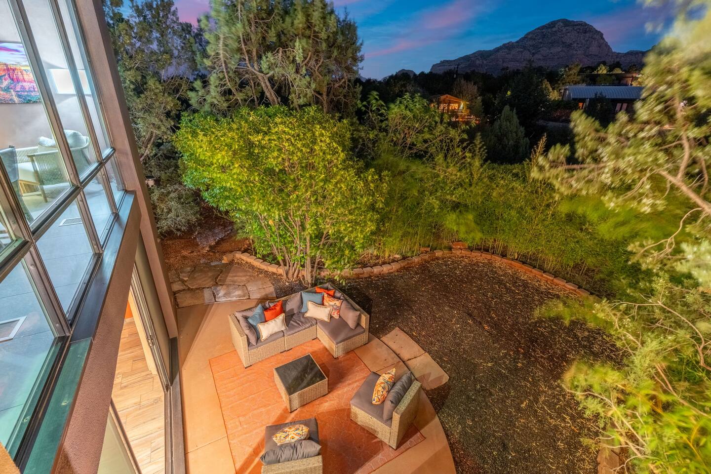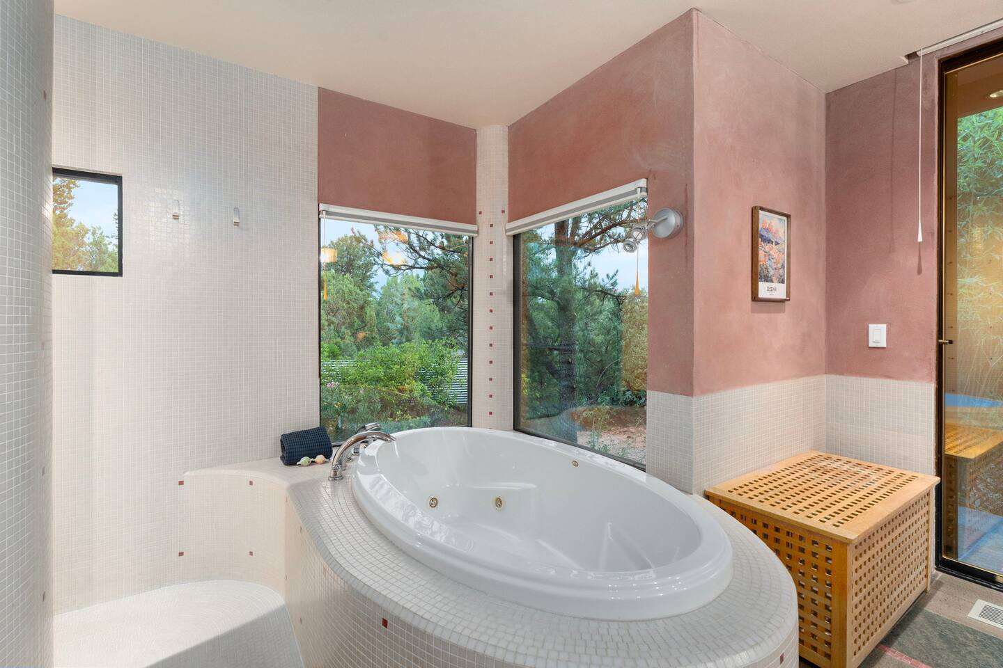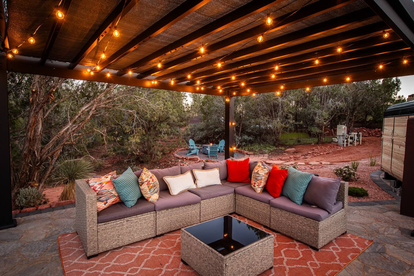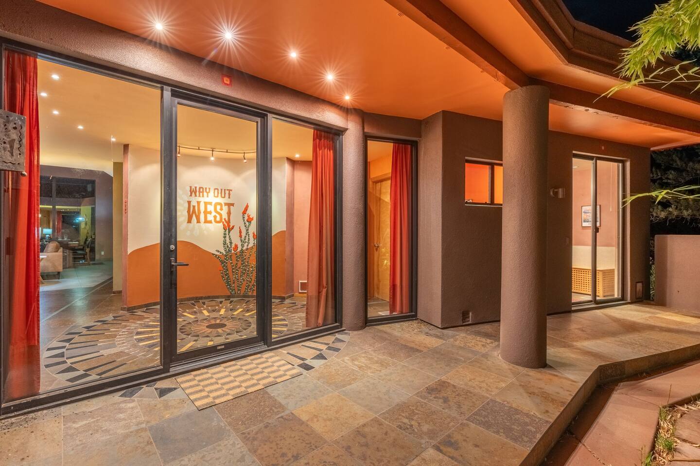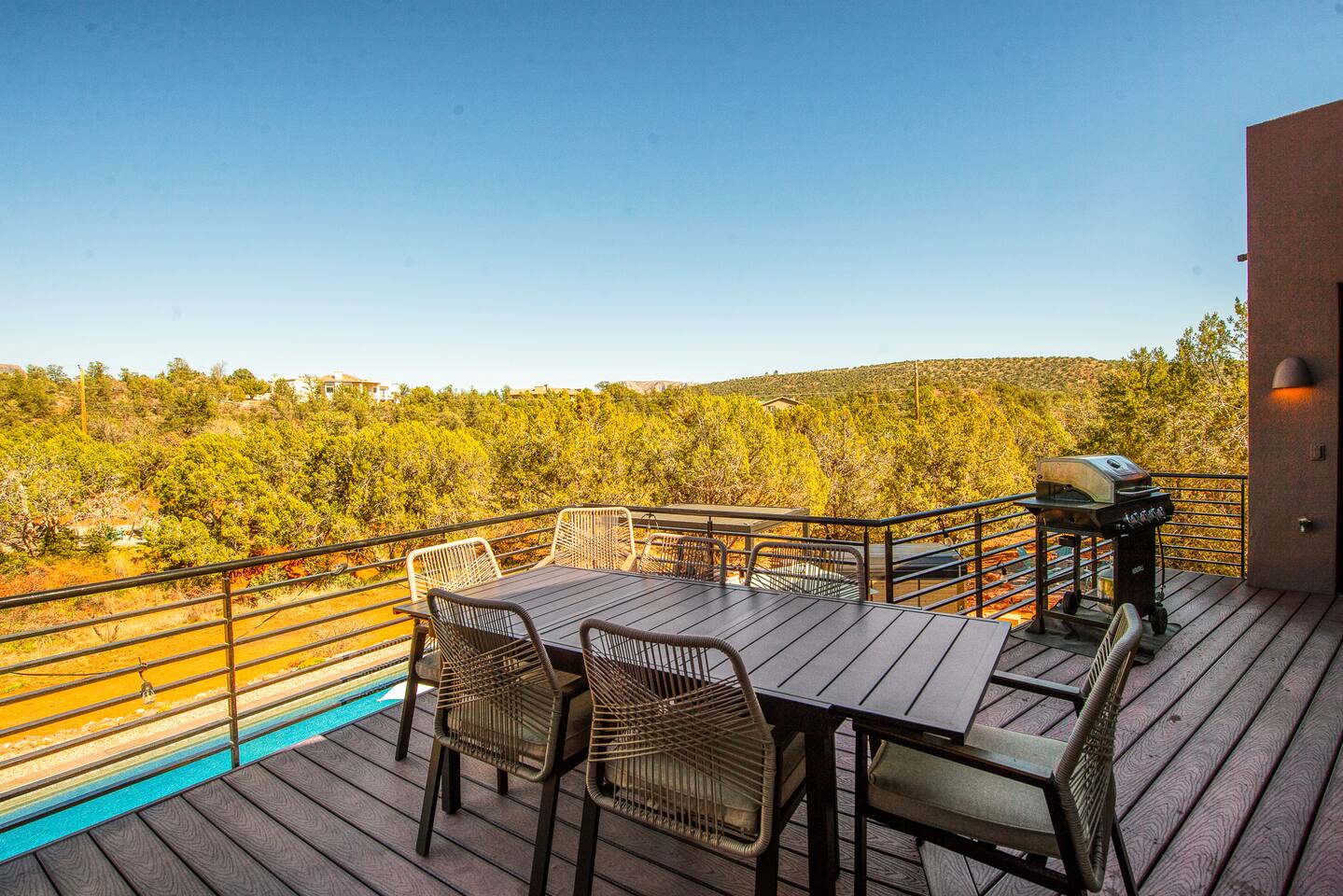 ***EXTERIOR HIGHLIGHTS*** 🏊 Brand New 20'x35' Luxury Heated Saltwater Pool & Spa — Featuring a sun shelf, basketball hoop, and rinse shower! Year round heating available for $100–$150/day – see FAQs for details. Plenty of hardscape area for yoga, meditation, healing, and wellness activities 🌲 Large and private 1-acre wooded lot with a natural desert wash and breathtaking views 🥾 Direct access to a well-maintained trail system right from the backyard ♨️ Authentic cedar cube sauna seats 4-6 🏗️ Pergola and shaded lounge furniture 🔥 2 Cozy gas fire features with Adirondack chairs or soft seating - perfect for desert evenings 🏓 Ping pong table and cornhole. The ping pong tables doubles as a dining table - 12 chairs provided 🍽️ Scenic view deck off the main kitchen with dining for 7 ☕ Private bistro deck off bedroom 2 — ideal for morning coffee or intimate dining for 2 🍽️ Covered patio adjacent to walkout basement with dining for 12 🍖 BBQ grill with complimentary propane 🔌 Stage two EV charger (see FAQs for details) 🌌 Located in a Certified Dark Sky community — ideal for world-class stargazing 🦌 Wildlife: bobcats, jack rabbits, mule deer, owls, javelinas, lizards, and more! ***INTERIOR HIGHLIGHTS*** 🏠 Over 4,000 sq ft of designer-appointed space with stunning floor-to-ceiling windows 🎱 Awesome game room with dual sim racer video game system, pool table, shuffleboard, foosball, and board games! 💺 Massage chair in primary bedroom and heated tile floors in the two ensuite bathrooms 🏋️ Exercise room with swiveling wall-mount bike rack (accommodates 4 large mountain bikes), 3 cushioned yoga mats, exercise ball, bench, dumbells, kettlebells, and a Power Tower 🛋️ Two spacious living rooms with gas fireplaces, smart TVs, and panoramic red rock views 🍽️ Dining for 14 on the main level + 8 more on the lower level — ideal for large groups 🛏️ Uniquely styled bedrooms with memory foam mattresses, smart TVs, and expansive windows 🎮 Bunk room with retro arcade games, smart TV, and reading nook 👨🍳 Fully equipped, chef-ready kitchen on the main level plus a kitchenette with large countertop bar and seating in the basement 🧺 Full laundry with a second dryer for extended stays 🐾 Pets allowed (max of 2 dogs — you must notify host before bringing pets to obtain pre-approval. Please be sure to clean up after your pets. See FAQs for pet details) 🌱 Eco-friendly construction with solar panels, low-VOC materials, and energy-efficient systems ⚡ Fast & Free WiFi MAIN LIVING AREAS: Featuring an open concept with a gas fireplace, full window wall, colorful paint palette, and stunning views of the red rocks, the living room has direct access to two separate decks. The lower level living room also has a fireplace and full glass wall with direct access to the backyard patio and pool area via large sliding glass doors for true indoor/outdoor living. KITCHENS: You'll have everything you need for preparing meals for large groups. In addition to all the standard appliances and kitchen essentials, there's a Keurig with pods provided, blender, filtered water, basic spices, olive oil, dish soap, trash liners, paper towels, dish sponge, cookie sheets, baking dishes, cutting board, mixing bowls, colander, serving bowls/plates, cheese grater, pitcher, wine bottle opener, can opener, pots & pans, measuring cups, spatulas, ladle, whisk, pizza cutter, and more. PRIMARY BEDROOM: This luxurious ensuite bedroom features a king memory foam bed and abundant natural light with a full glass view wall and a massage chair. The bathroom has a custom walk-in mosaic shower with dual shower heads, dual vanities, a huge closet, and a jetted tub. BEDROOM 2: Located on the main level, this bedroom has a king memory foam bed, smart TV, and floor-to-ceiling windows with access to a private deck with seating for 2. The bathroom is accessed through the adjacent hallway. BEDROOM 3: Located on the lower level, this ensuite bedroom features 2 memory foam queen beds and a smart TV with a sliding glass door to access the back yard. The bathroom has double vanities, a tub/shower, and a huge walk-in closet BEDROOM 4: Located on the lower level, this bedroom features a king memory foam bed and floor-to ceiling windows with access to the pool/patio via a sliding glass door. The bathroom has a walk-in shower and is shared with the bedroom 5 (bunk room) and can be isolated from the rest of the home to make a private unit using the keypad lock in the hallway if desired. BEDROOM 5: Located adjacent to bedroom 4 is the bunk room, complete with 2 bunk beds, a smart TV, an arcade console, and a reading nook. PRIVATE BACKYARD OASIS: Recline on the comfortable loungers by the expansive 35’x20’ heated pool complete with basketball hoop, baja lounge shelf, large paver deck with a pergola and gas firepit, a rinse-off shower, and colorful LED night lighting. GAME ROOM: Features a full desert mural on all four walls and the ceiling. There's something for everyone with board games, pool table, shuffleboard, foosball, and sim racing style video games on Xbox like Forza Horizon 5. The sim racing setup includes two cockpits for head-to-head racing. Each cockpit has it's own realistic racing seat, steering wheel, and pedals + noise canceling headphones and a 55" TV so that you can zero in on smokin' the competition! EXERCISE ROOM: You won't have to miss a workout while you're visiting Sedona - just visit the "Desert Gains" gym! Equipment includes an exercise ball, cushioned mats, bench, dumbells, and kettlebells. Use the Power Tower for pull-ups, dips, leg raises, pushups, calf raises, and more. Other things to note: Maintenance personnel performing pest control services, spa maintenance, filter changes, and other light maintenance tasks will occasionally need access to the property. They may show up during normal business hours without notice and will knock and ring the d