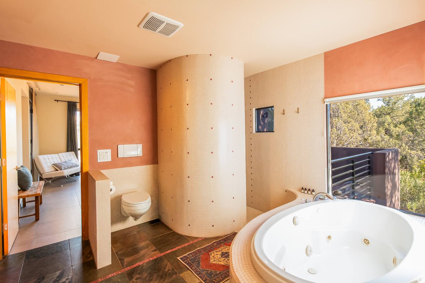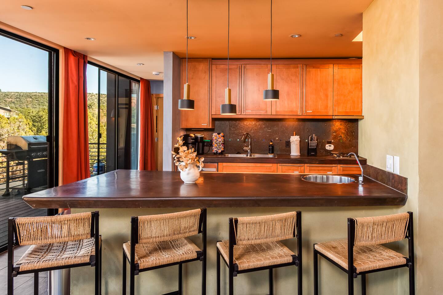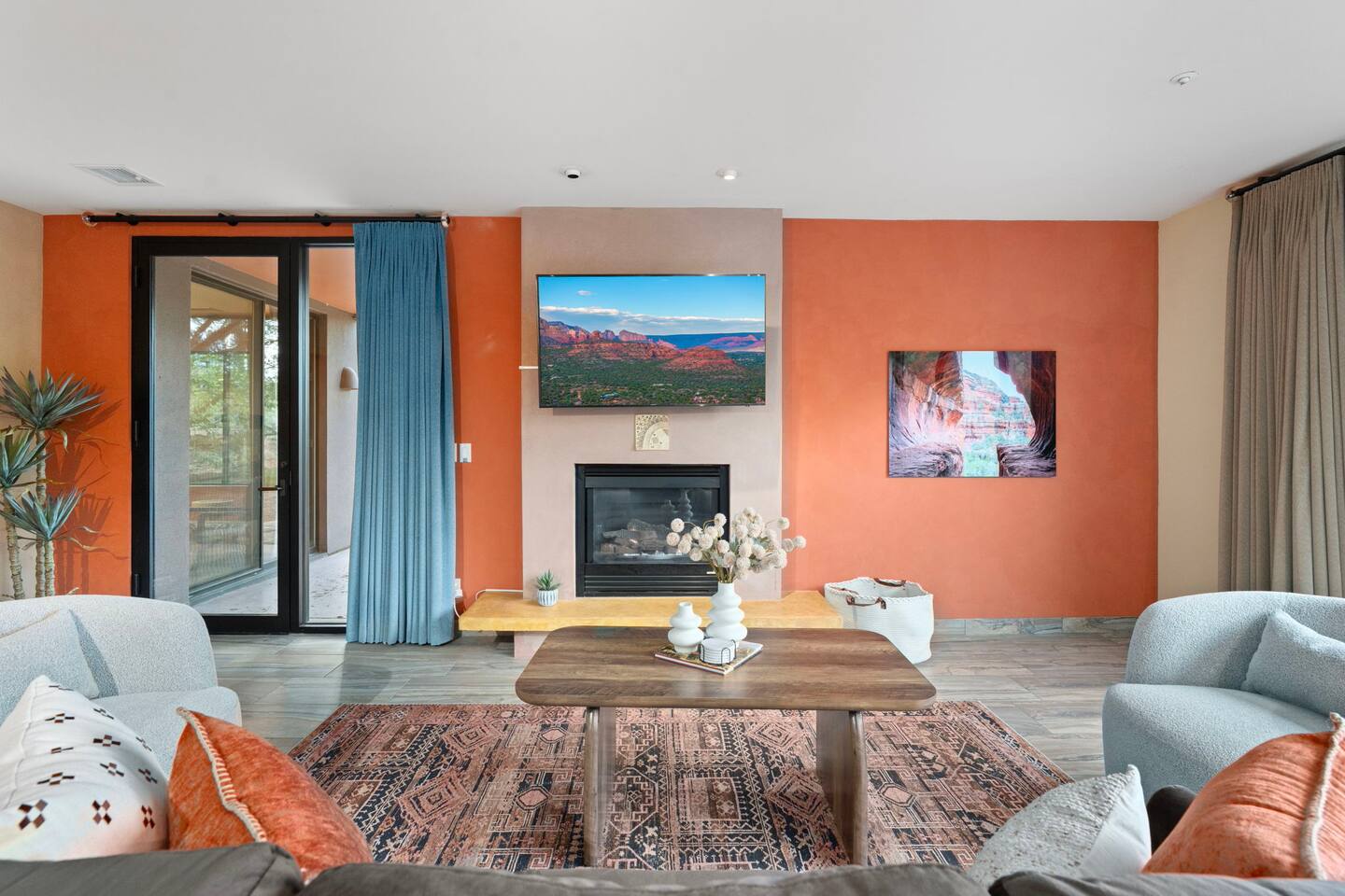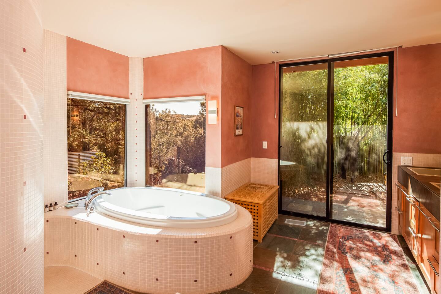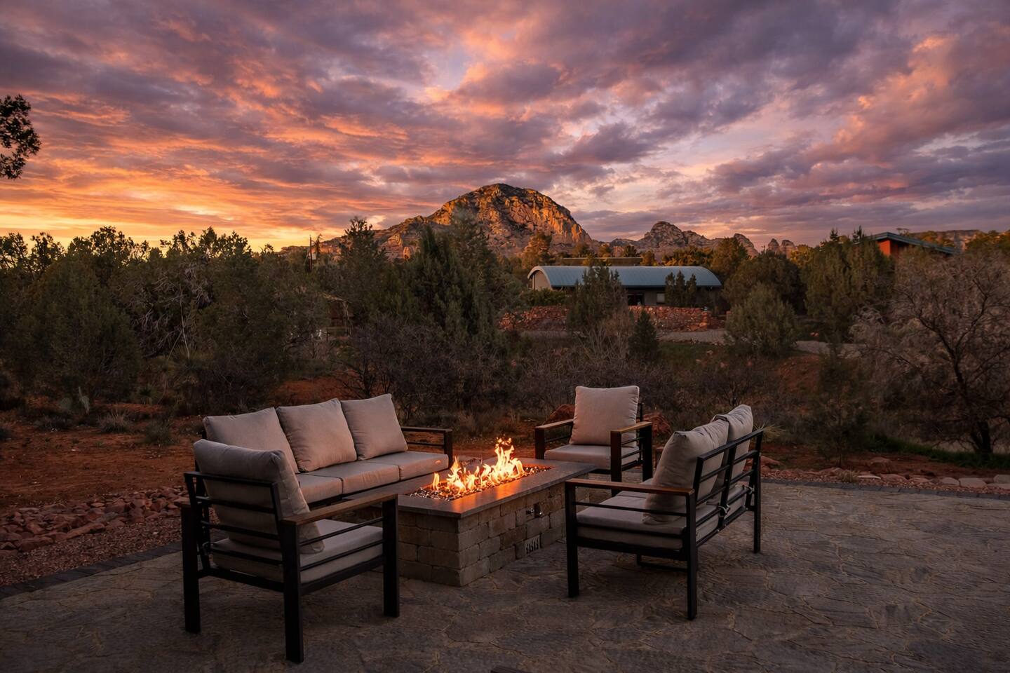 ***EXTERIOR HIGHLIGHTS*** 🏊 Brand New 20'x35' Luxury Heated Saltwater Pool & Spa — Featuring a sun shelf, basketball hoop, and rinse shower! Year round heating available for $100–$150/day – see FAQs for details. Plenty of hardscape area for yoga, meditation, healing, and wellness activities 🌲 Large and private 1-acre wooded lot with a natural desert wash and breathtaking views 🥾 Direct access to a well-maintained trail system right from the backyard ♨️ Authentic cedar cube sauna seats 4-6 🏗️ Pergola and shaded lounge furniture 🔥 2 Cozy gas fire features with Adirondack chairs or soft seating - perfect for desert evenings 🏓 Ping pong table and cornhole. The ping pong tables doubles as a dining table - 12 chairs provided 🍽️ Scenic view deck off the main kitchen with dining for 7 ☕ Private bistro deck off bedroom 2 — ideal for morning coffee or intimate dining for 2 🍽️ Covered patio adjacent to walkout basement with dining for 12 🍖 BBQ grill with complimentary propane 🔌 Stage two EV charger (see FAQs for details) 🌌 Located in a Certified Dark Sky community — ideal for world-class stargazing 🦌 Wildlife: bobcats, jack rabbits, mule deer, owls, javelinas, lizards, and more! ***INTERIOR HIGHLIGHTS*** 🏠 Over 4,000 sq ft of designer-appointed space with stunning floor-to-ceiling windows 🎱 Awesome game room with dual sim racer video game system, pool table, shuffleboard, foosball, and board games! 💺 Massage chair in primary bedroom and heated tile floors in the two ensuite bathrooms 🏋️ Exercise room with swiveling wall-mount bike rack (accommodates 4 large mountain bikes), 3 cushioned yoga mats, exercise ball, bench, dumbells, kettlebells, and a Power Tower 🛋️ Two spacious living rooms with gas fireplaces, smart TVs, and panoramic red rock views 🍽️ Dining for 14 on the main level + 8 more on the lower level — ideal for large groups 🛏️ Uniquely styled bedrooms with memory foam mattresses, smart TVs, and expansive windows 🎮 Bunk room with retro arcade games, smart TV, and reading nook 👨🍳 Fully equipped, chef-ready kitchen on the main level plus a kitchenette with large countertop bar and seating in the basement 🧺 Full laundry with a second dryer for extended stays 🐾 Pets allowed (max of 2 dogs — you must notify host before bringing pets to obtain pre-approval. Please be sure to clean up after your pets. See FAQs for pet details) 🌱 Eco-friendly construction with solar panels, low-VOC materials, and energy-efficient systems ⚡ Fast & Free WiFi MAIN LIVING AREAS: Featuring an open concept with a gas fireplace, full window wall, colorful paint palette, and stunning views of the red rocks, the living room has direct access to two separate decks. The lower level living room also has a fireplace and full glass wall with direct access to the backyard patio and pool area via large sliding glass doors for true indoor/outdoor living. KITCHENS: You'll have everything you need for preparing meals for large groups. In addition to all the standard appliances and kitchen essentials, there's a Keurig with pods provided, blender, filtered water, basic spices, olive oil, dish soap, trash liners, paper towels, dish sponge, cookie sheets, baking dishes, cutting board, mixing bowls, colander, serving bowls/plates, cheese grater, pitcher, wine bottle opener, can opener, pots & pans, measuring cups, spatulas, ladle, whisk, pizza cutter, and more. PRIMARY BEDROOM: This luxurious ensuite bedroom features a king memory foam bed and abundant natural light with a full glass view wall and a massage chair. The bathroom has a custom walk-in mosaic shower with dual shower heads, dual vanities, a huge closet, and a jetted tub. BEDROOM 2: Located on the main level, this bedroom has a king memory foam bed, smart TV, and floor-to-ceiling windows with access to a private deck with seating for 2. The bathroom is accessed through the adjacent hallway. BEDROOM 3: Located on the lower level, this ensuite bedroom features 2 memory foam queen beds and a smart TV with a sliding glass door to access the back yard. The bathroom has double vanities, a tub/shower, and a huge walk-in closet BEDROOM 4: Located on the lower level, this bedroom features a king memory foam bed and floor-to ceiling windows with access to the pool/patio via a sliding glass door. The bathroom has a walk-in shower and is shared with the bedroom 5 (bunk room) and can be isolated from the rest of the home to make a private unit using the keypad lock in the hallway if desired. BEDROOM 5: Located adjacent to bedroom 4 is the bunk room, complete with 2 bunk beds, a smart TV, an arcade console, and a reading nook. PRIVATE BACKYARD OASIS: Recline on the comfortable loungers by the expansive 35’x20’ heated pool complete with basketball hoop, baja lounge shelf, large paver deck with a pergola and gas firepit, a rinse-off shower, and colorful LED night lighting. GAME ROOM: Features a full desert mural on all four walls and the ceiling. There's something for everyone with board games, pool table, shuffleboard, foosball, and sim racing style video games on Xbox like Forza Horizon 5. The sim racing setup includes two cockpits for head-to-head racing. Each cockpit has it's own realistic racing seat, steering wheel, and pedals + noise canceling headphones and a 55" TV so that you can zero in on smokin' the competition! EXERCISE ROOM: You won't have to miss a workout while you're visiting Sedona - just visit the "Desert Gains" gym! Equipment includes an exercise ball, cushioned mats, bench, dumbells, and kettlebells. Use the Power Tower for pull-ups, dips, leg raises, pushups, calf raises, and more. Other things to note: Maintenance personnel performing pest control services, spa maintenance, filter changes, and other light maintenance tasks will occasionally need access to the property. They may show up during normal business hours without notice and will knock and ring the d
