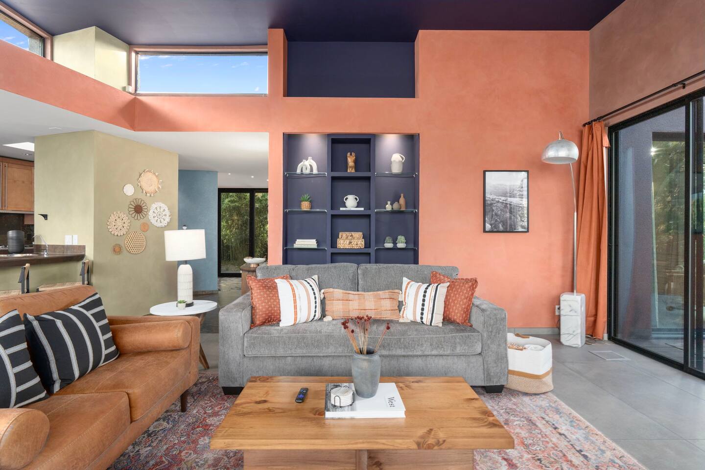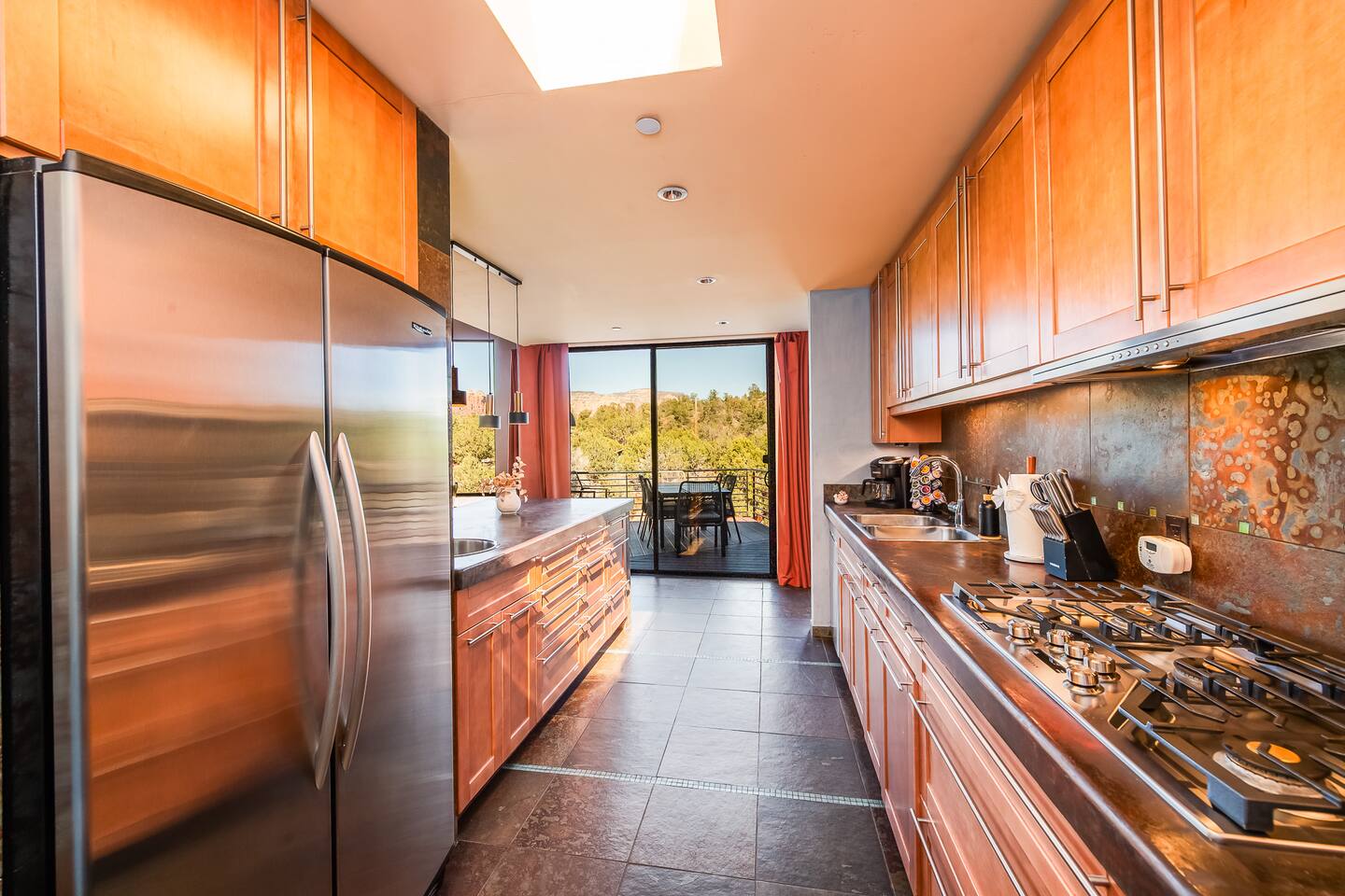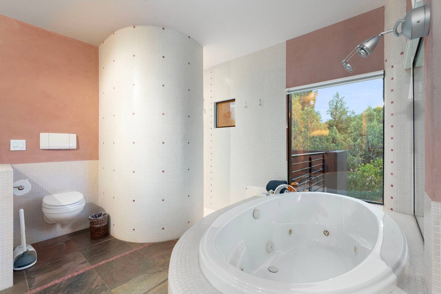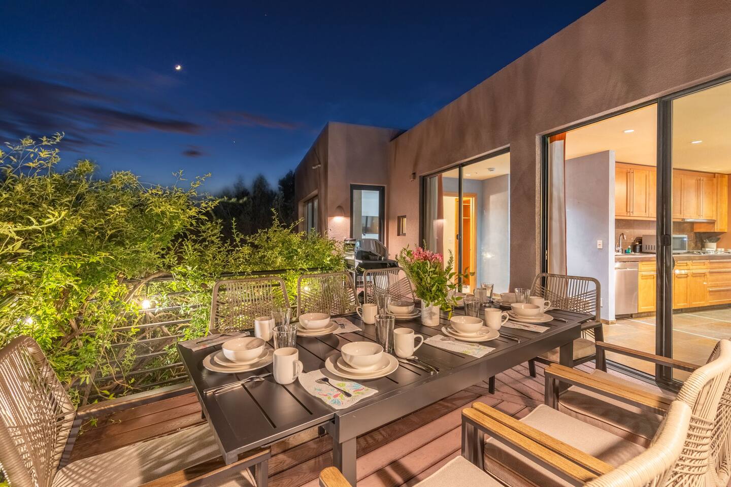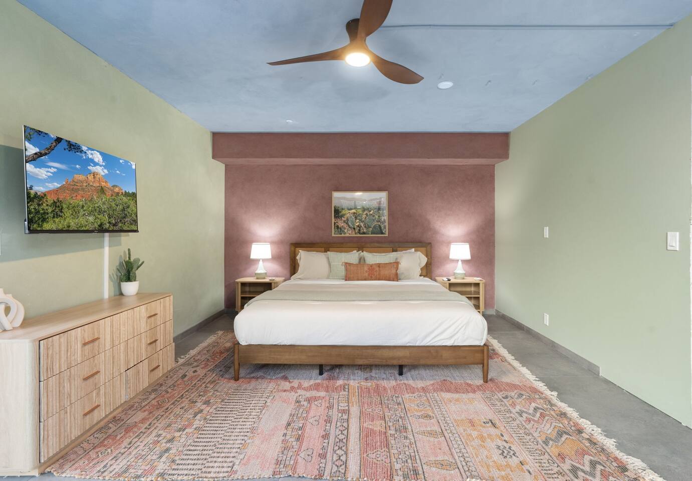 ***EXTERIOR HIGHLIGHTS*** 🏊 Brand New 20'x35' Luxury Heated Saltwater Pool & Spa — Featuring a sun shelf, basketball hoop, and rinse shower! Year round heating available for $100–$150/day – see FAQs for details. Plenty of hardscape area for yoga, meditation, healing, and wellness activities 🌲 Large and private 1-acre wooded lot with a natural desert wash and breathtaking views 🥾 Direct access to a well-maintained trail system right from the backyard ♨️ Authentic cedar cube sauna seats 4-6 🏗️ Pergola and shaded lounge furniture 🔥 2 Cozy gas fire features with Adirondack chairs or soft seating - perfect for desert evenings 🏓 Ping pong table and cornhole. The ping pong tables doubles as a dining table - 12 chairs provided 🍽️ Scenic view deck off the main kitchen with dining for 7 ☕ Private bistro deck off bedroom 2 — ideal for morning coffee or intimate dining for 2 🍽️ Covered patio adjacent to walkout basement with dining for 12 🍖 BBQ grill with complimentary propane 🔌 Stage two EV charger (see FAQs for details) 🌌 Located in a Certified Dark Sky community — ideal for world-class stargazing 🦌 Wildlife: bobcats, jack rabbits, mule deer, owls, javelinas, lizards, and more! ***INTERIOR HIGHLIGHTS*** 🏠 Over 4,000 sq ft of designer-appointed space with stunning floor-to-ceiling windows 🎱 Awesome game room with dual sim racer video game system, pool table, shuffleboard, foosball, and board games! 💺 Massage chair in primary bedroom and heated tile floors in the two ensuite bathrooms 🏋️ Exercise room with swiveling wall-mount bike rack (accommodates 4 large mountain bikes), 3 cushioned yoga mats, exercise ball, bench, dumbells, kettlebells, and a Power Tower 🛋️ Two spacious living rooms with gas fireplaces, smart TVs, and panoramic red rock views 🍽️ Dining for 14 on the main level + 8 more on the lower level — ideal for large groups 🛏️ Uniquely styled bedrooms with memory foam mattresses, smart TVs, and expansive windows 🎮 Bunk room with retro arcade games, smart TV, and reading nook 👨🍳 Fully equipped, chef-ready kitchen on the main level plus a kitchenette with large countertop bar and seating in the basement 🧺 Full laundry with a second dryer for extended stays 🐾 Pets allowed (max of 2 dogs — you must notify host before bringing pets to obtain pre-approval. Please be sure to clean up after your pets. See FAQs for pet details) 🌱 Eco-friendly construction with solar panels, low-VOC materials, and energy-efficient systems ⚡ Fast & Free WiFi MAIN LIVING AREAS: Featuring an open concept with a gas fireplace, full window wall, colorful paint palette, and stunning views of the red rocks, the living room has direct access to two separate decks. The lower level living room also has a fireplace and full glass wall with direct access to the backyard patio and pool area via large sliding glass doors for true indoor/outdoor living. KITCHENS: You'll have everything you need for preparing meals for large groups. In addition to all the standard appliances and kitchen essentials, there's a Keurig with pods provided, blender, filtered water, basic spices, olive oil, dish soap, trash liners, paper towels, dish sponge, cookie sheets, baking dishes, cutting board, mixing bowls, colander, serving bowls/plates, cheese grater, pitcher, wine bottle opener, can opener, pots & pans, measuring cups, spatulas, ladle, whisk, pizza cutter, and more. PRIMARY BEDROOM: This luxurious ensuite bedroom features a king memory foam bed and abundant natural light with a full glass view wall and a massage chair. The bathroom has a custom walk-in mosaic shower with dual shower heads, dual vanities, a huge closet, and a jetted tub. BEDROOM 2: Located on the main level, this bedroom has a king memory foam bed, smart TV, and floor-to-ceiling windows with access to a private deck with seating for 2. The bathroom is accessed through the adjacent hallway. BEDROOM 3: Located on the lower level, this ensuite bedroom features 2 memory foam queen beds and a smart TV with a sliding glass door to access the back yard. The bathroom has double vanities, a tub/shower, and a huge walk-in closet BEDROOM 4: Located on the lower level, this bedroom features a king memory foam bed and floor-to ceiling windows with access to the pool/patio via a sliding glass door. The bathroom has a walk-in shower and is shared with the bedroom 5 (bunk room) and can be isolated from the rest of the home to make a private unit using the keypad lock in the hallway if desired. BEDROOM 5: Located adjacent to bedroom 4 is the bunk room, complete with 2 bunk beds, a smart TV, an arcade console, and a reading nook. PRIVATE BACKYARD OASIS: Recline on the comfortable loungers by the expansive 35’x20’ heated pool complete with basketball hoop, baja lounge shelf, large paver deck with a pergola and gas firepit, a rinse-off shower, and colorful LED night lighting. GAME ROOM: Features a full desert mural on all four walls and the ceiling. There's something for everyone with board games, pool table, shuffleboard, foosball, and sim racing style video games on Xbox like Forza Horizon 5. The sim racing setup includes two cockpits for head-to-head racing. Each cockpit has it's own realistic racing seat, steering wheel, and pedals + noise canceling headphones and a 55" TV so that you can zero in on smokin' the competition! EXERCISE ROOM: You won't have to miss a workout while you're visiting Sedona - just visit the "Desert Gains" gym! Equipment includes an exercise ball, cushioned mats, bench, dumbells, and kettlebells. Use the Power Tower for pull-ups, dips, leg raises, pushups, calf raises, and more. Other things to note: Maintenance personnel performing pest control services, spa maintenance, filter changes, and other light maintenance tasks will occasionally need access to the property. They may show up during normal business hours without notice and will knock and ring the d