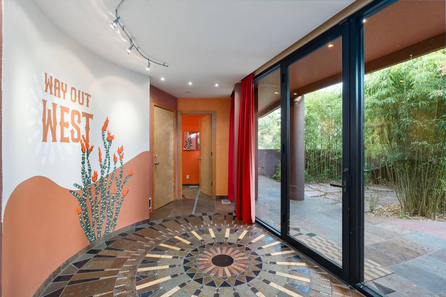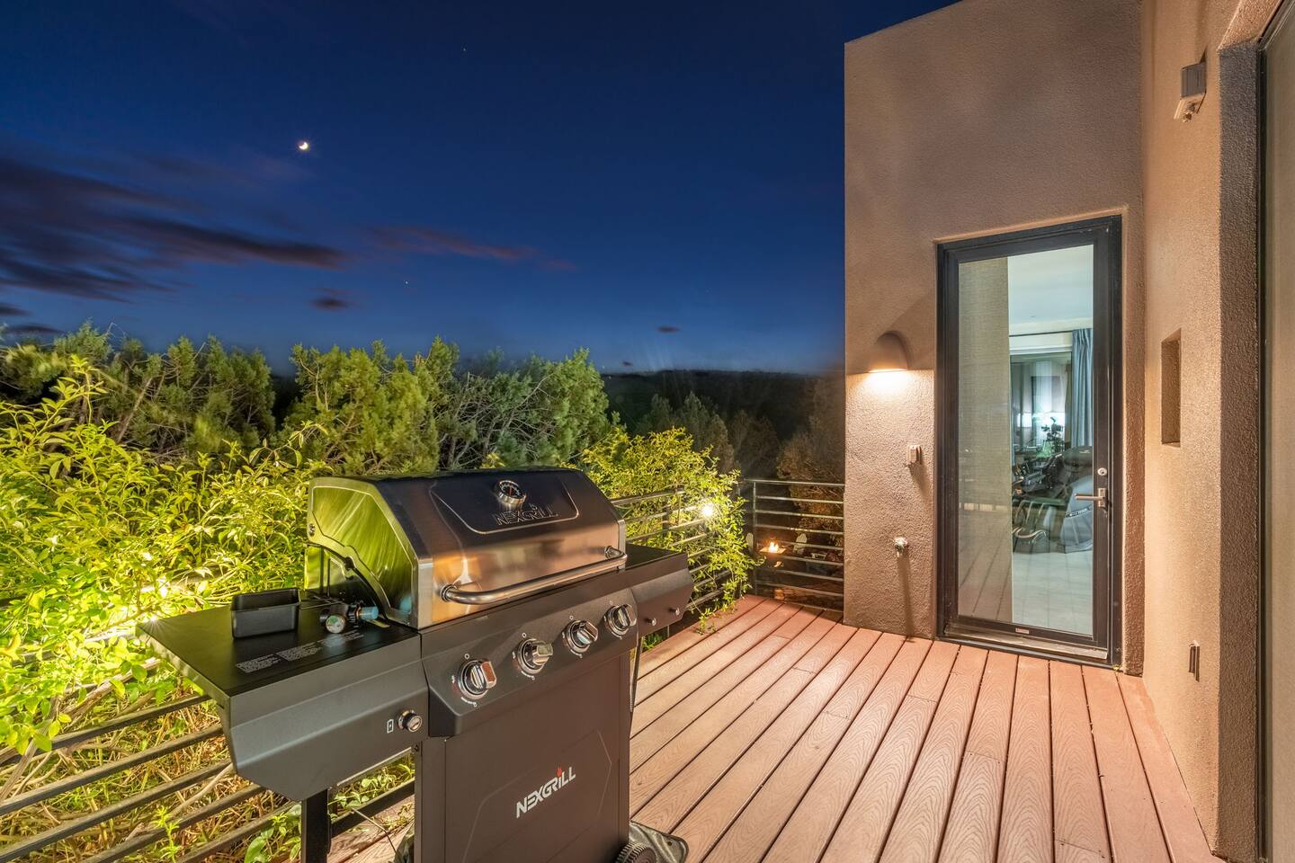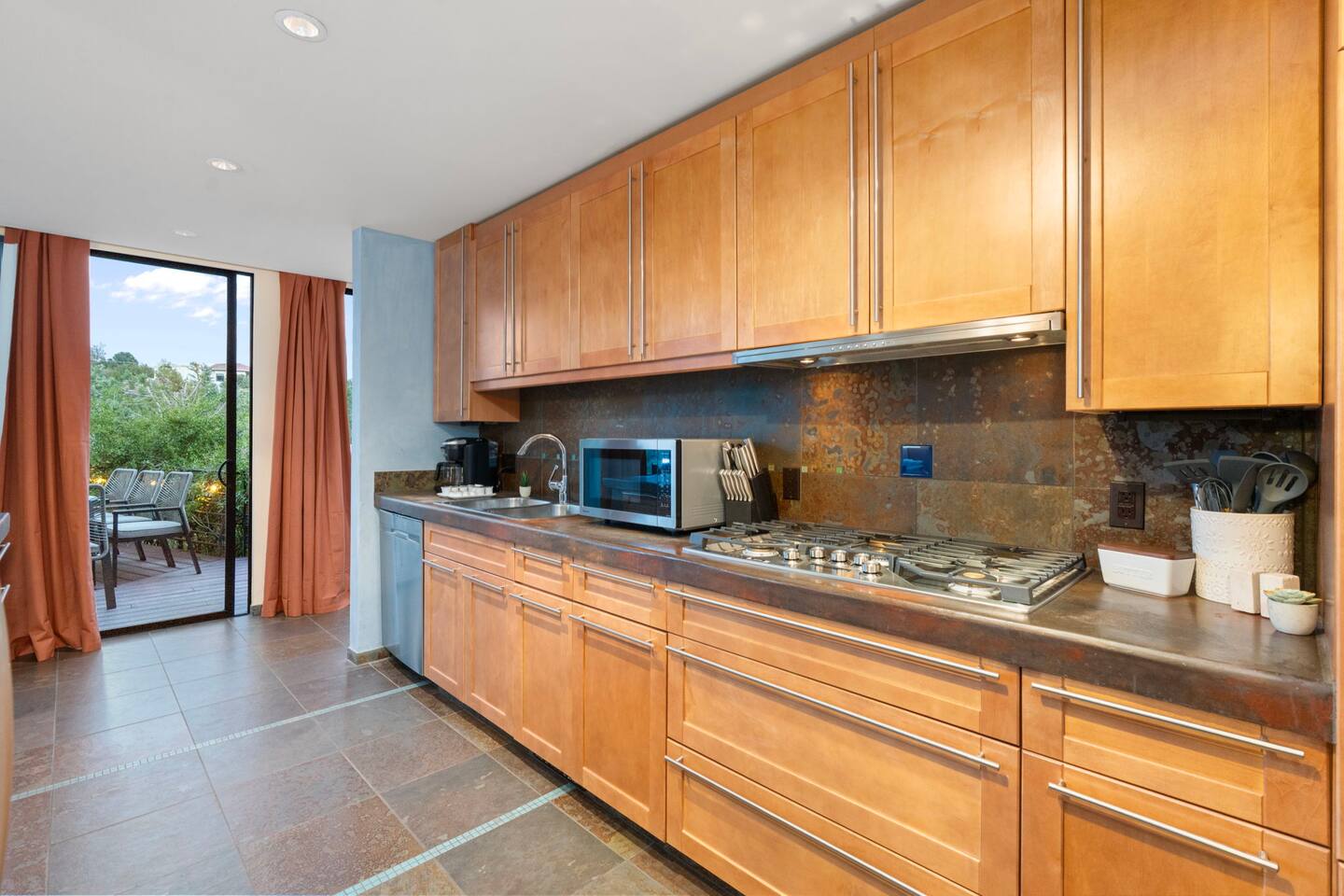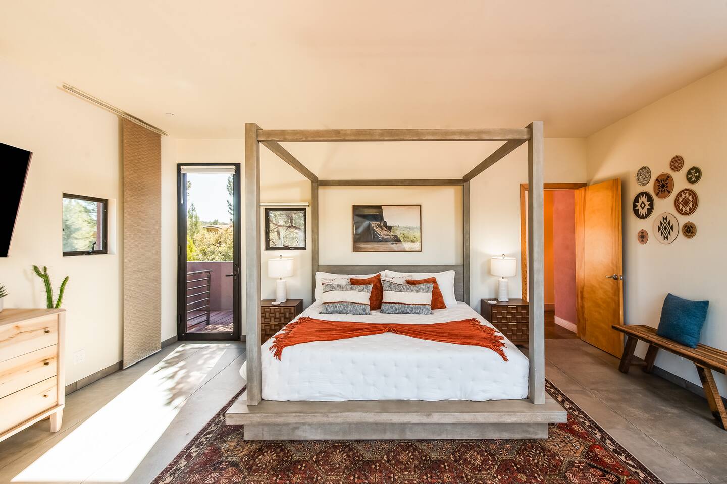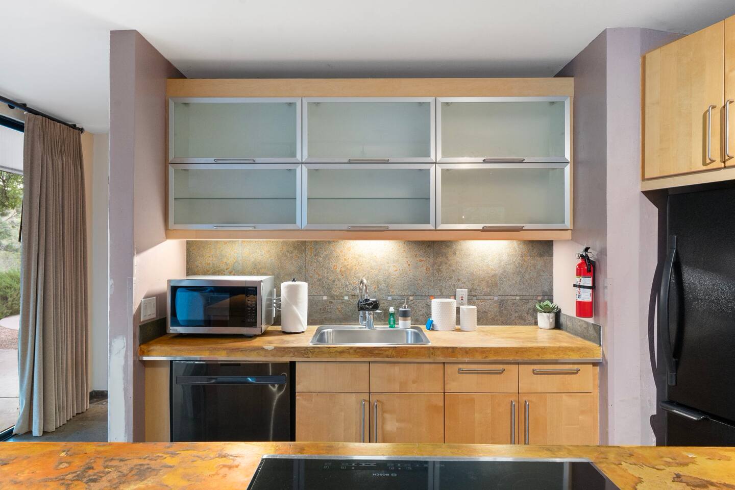 ***EXTERIOR HIGHLIGHTS*** 🏊 Brand New 20'x35' Luxury Heated Saltwater Pool & Spa — Featuring a sun shelf, basketball hoop, and rinse shower! Year round heating available for $100–$150/day – see FAQs for details. Plenty of hardscape area for yoga, meditation, healing, and wellness activities 🌲 Large and private 1-acre wooded lot with a natural desert wash and breathtaking views 🥾 Direct access to a well-maintained trail system right from the backyard ♨️ Authentic cedar cube sauna seats 4-6 🏗️ Pergola and shaded lounge furniture 🔥 2 Cozy gas fire features with Adirondack chairs or soft seating - perfect for desert evenings 🏓 Ping pong table and cornhole. The ping pong tables doubles as a dining table - 12 chairs provided 🍽️ Scenic view deck off the main kitchen with dining for 7 ☕ Private bistro deck off bedroom 2 — ideal for morning coffee or intimate dining for 2 🍽️ Covered patio adjacent to walkout basement with dining for 12 🍖 BBQ grill with complimentary propane 🔌 Stage two EV charger (see FAQs for details) 🌌 Located in a Certified Dark Sky community — ideal for world-class stargazing 🦌 Wildlife: bobcats, jack rabbits, mule deer, owls, javelinas, lizards, and more! ***INTERIOR HIGHLIGHTS*** 🏠 Over 4,000 sq ft of designer-appointed space with stunning floor-to-ceiling windows 🎱 Awesome game room with dual sim racer video game system, pool table, shuffleboard, foosball, and board games! 💺 Massage chair in primary bedroom and heated tile floors in the two ensuite bathrooms 🏋️ Exercise room with swiveling wall-mount bike rack (accommodates 4 large mountain bikes), 3 cushioned yoga mats, exercise ball, bench, dumbells, kettlebells, and a Power Tower 🛋️ Two spacious living rooms with gas fireplaces, smart TVs, and panoramic red rock views 🍽️ Dining for 14 on the main level + 8 more on the lower level — ideal for large groups 🛏️ Uniquely styled bedrooms with memory foam mattresses, smart TVs, and expansive windows 🎮 Bunk room with retro arcade games, smart TV, and reading nook 👨🍳 Fully equipped, chef-ready kitchen on the main level plus a kitchenette with large countertop bar and seating in the basement 🧺 Full laundry with a second dryer for extended stays 🐾 Pets allowed (max of 2 dogs — you must notify host before bringing pets to obtain pre-approval. Please be sure to clean up after your pets. See FAQs for pet details) 🌱 Eco-friendly construction with solar panels, low-VOC materials, and energy-efficient systems ⚡ Fast & Free WiFi MAIN LIVING AREAS: Featuring an open concept with a gas fireplace, full window wall, colorful paint palette, and stunning views of the red rocks, the living room has direct access to two separate decks. The lower level living room also has a fireplace and full glass wall with direct access to the backyard patio and pool area via large sliding glass doors for true indoor/outdoor living. KITCHENS: You'll have everything you need for preparing meals for large groups. In addition to all the standard appliances and kitchen essentials, there's a Keurig with pods provided, blender, filtered water, basic spices, olive oil, dish soap, trash liners, paper towels, dish sponge, cookie sheets, baking dishes, cutting board, mixing bowls, colander, serving bowls/plates, cheese grater, pitcher, wine bottle opener, can opener, pots & pans, measuring cups, spatulas, ladle, whisk, pizza cutter, and more. PRIMARY BEDROOM: This luxurious ensuite bedroom features a king memory foam bed and abundant natural light with a full glass view wall and a massage chair. The bathroom has a custom walk-in mosaic shower with dual shower heads, dual vanities, a huge closet, and a jetted tub. BEDROOM 2: Located on the main level, this bedroom has a king memory foam bed, smart TV, and floor-to-ceiling windows with access to a private deck with seating for 2. The bathroom is accessed through the adjacent hallway. BEDROOM 3: Located on the lower level, this ensuite bedroom features 2 memory foam queen beds and a smart TV with a sliding glass door to access the back yard. The bathroom has double vanities, a tub/shower, and a huge walk-in closet BEDROOM 4: Located on the lower level, this bedroom features a king memory foam bed and floor-to ceiling windows with access to the pool/patio via a sliding glass door. The bathroom has a walk-in shower and is shared with the bedroom 5 (bunk room) and can be isolated from the rest of the home to make a private unit using the keypad lock in the hallway if desired. BEDROOM 5: Located adjacent to bedroom 4 is the bunk room, complete with 2 bunk beds, a smart TV, an arcade console, and a reading nook. PRIVATE BACKYARD OASIS: Recline on the comfortable loungers by the expansive 35’x20’ heated pool complete with basketball hoop, baja lounge shelf, large paver deck with a pergola and gas firepit, a rinse-off shower, and colorful LED night lighting. GAME ROOM: Features a full desert mural on all four walls and the ceiling. There's something for everyone with board games, pool table, shuffleboard, foosball, and sim racing style video games on Xbox like Forza Horizon 5. The sim racing setup includes two cockpits for head-to-head racing. Each cockpit has it's own realistic racing seat, steering wheel, and pedals + noise canceling headphones and a 55" TV so that you can zero in on smokin' the competition! EXERCISE ROOM: You won't have to miss a workout while you're visiting Sedona - just visit the "Desert Gains" gym! Equipment includes an exercise ball, cushioned mats, bench, dumbells, and kettlebells. Use the Power Tower for pull-ups, dips, leg raises, pushups, calf raises, and more. Other things to note: Maintenance personnel performing pest control services, spa maintenance, filter changes, and other light maintenance tasks will occasionally need access to the property. They may show up during normal business hours without notice and will knock and ring the d